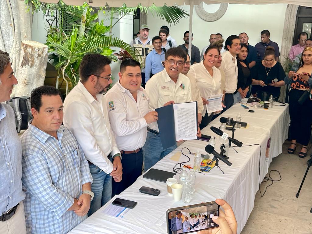 Los Cabos, B.C.S., 03 de julio 2023.- A fin de despejar rumores y malos entendidos en relación con la construcción y puesta en marcha de la nueva planta desaladora de 250 litros por segundos de agua potable en la delegación de Cabo San Lucas y de la Mejora Integral de Gestión (MIG) para la ampliación de la red de distribución, el presidente municipal de Los Cabos Oscar Leggs Castro, acompañado de la directora municipal de Comunicación Social Alejandrina Estrada Obregón, los representantes de las empresas desarrolladoras Cadebac, Acciona, Aqualia y La Peninsular, así como de Conagua, Banobras, Fonadin, Oomsapaslc y del donador del área de construcción, se reunió con medios de comunicación al interior de Palacio Municipal.