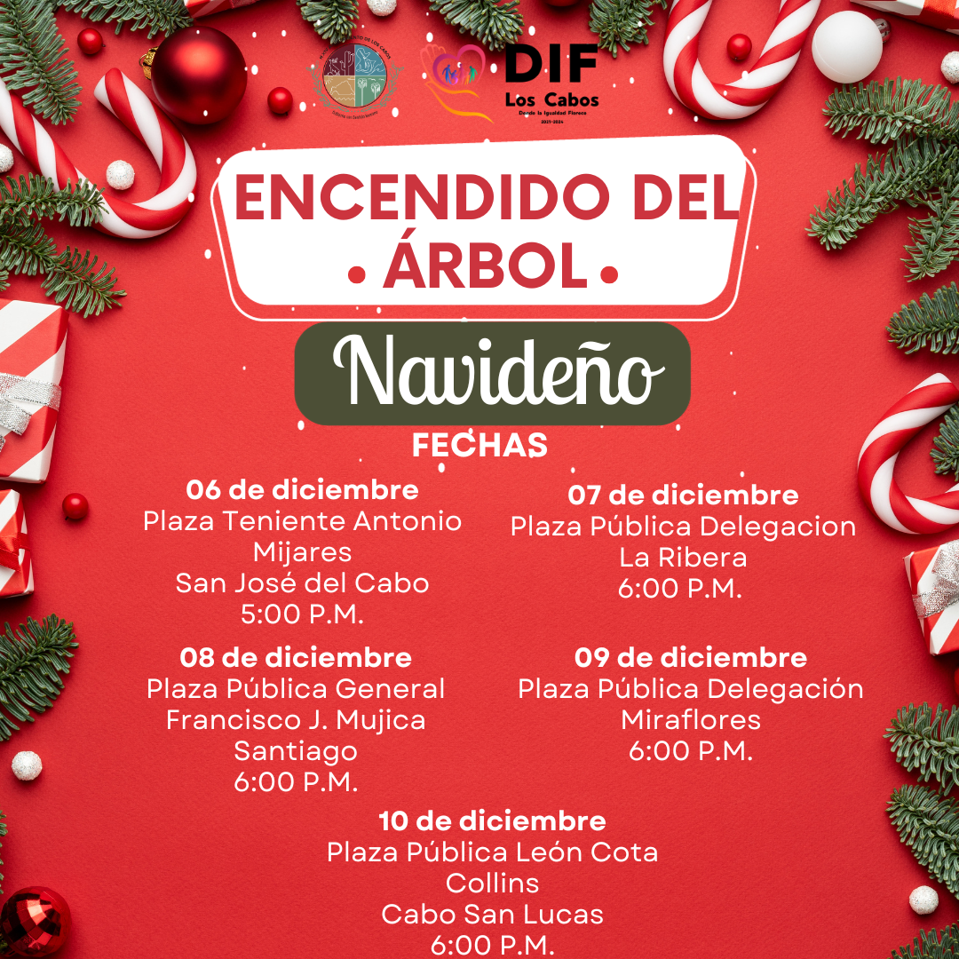 Los Cabos, B.C.S., 01 diciembre 2023.- Con el objetivo de mantener vivas las tradiciones que contribuyen a la convivencia familiar, el Sistema Municipal DIF Los Cabos que preside Flora Aguilar de Leggs, invita a la población cabeña a los encendidos de árboles navideños en la cabecera municipal y delegaciones; dichos eventos son totalmente gratuitos para la ciudadanía y podrán disfrutar de espectáculos artísticos afines a las festividades, así como del bazar navideño, donde podrán apreciar y adquirir productos navideños elaborados en los Centros de Desarrollo Comunitario del Sistema Municipal.