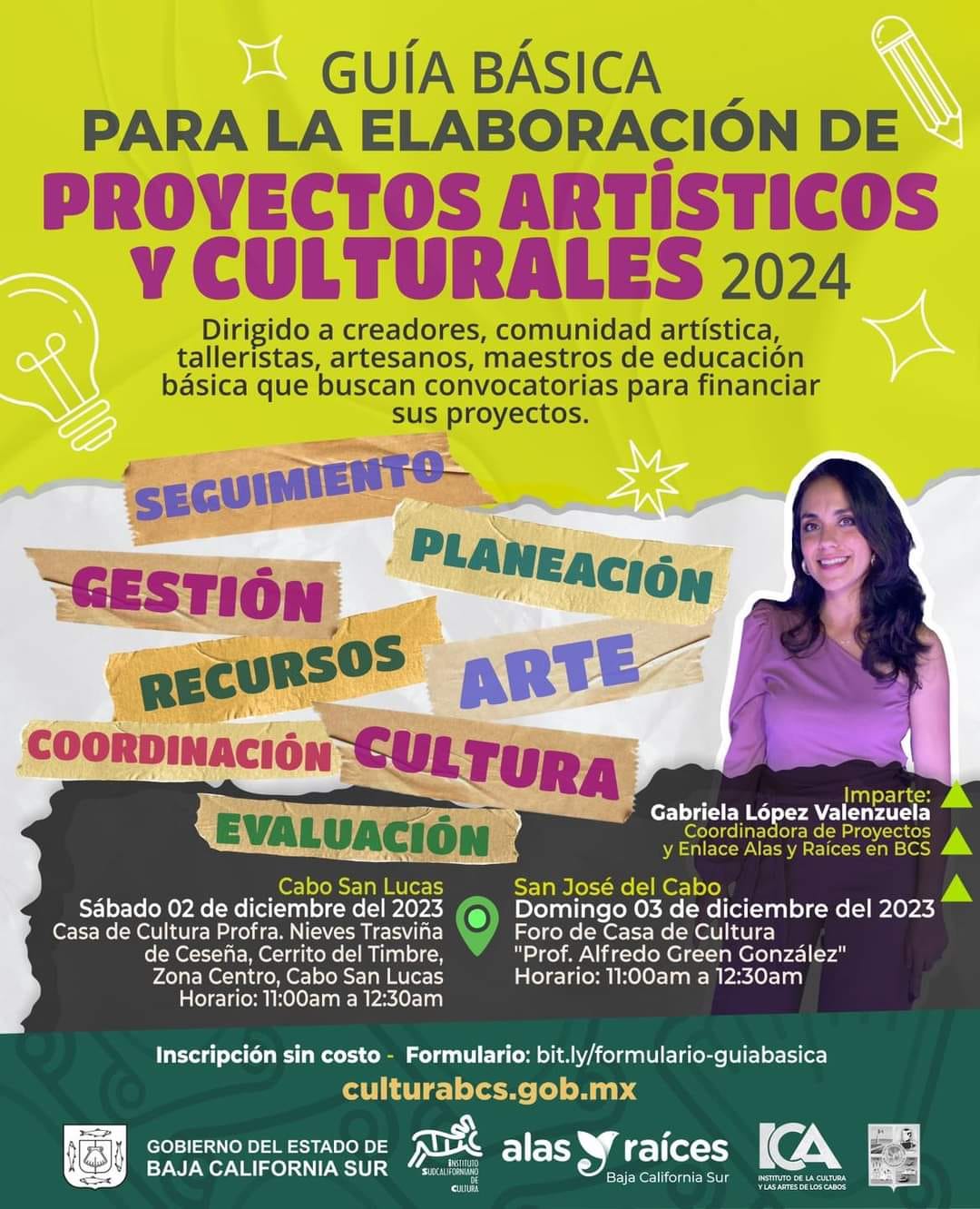 El servidor público informó que con el objetivo de planear, así como facilitar la gestión de recursos, evaluar y dar seguimiento a los proyectos de la comunidad artística de Los Cabos, la guía será impartida por la coordinadora de Proyectos y Enlace de Alas y Raíces en BCS Gabriel López Valenzuela, este sábado 02 de diciembre en la Casa de Cultura “Profesora Nieves Trasviña de Ceseña” en el Cerrito del Timbre de Cabo San Lucas y domingo 03 de diciembre en el foro de la Casa de Cultura “Profesor Alfredo Green González” en San José del Cabo de 11:00 de la mañana a 12:30 del día.