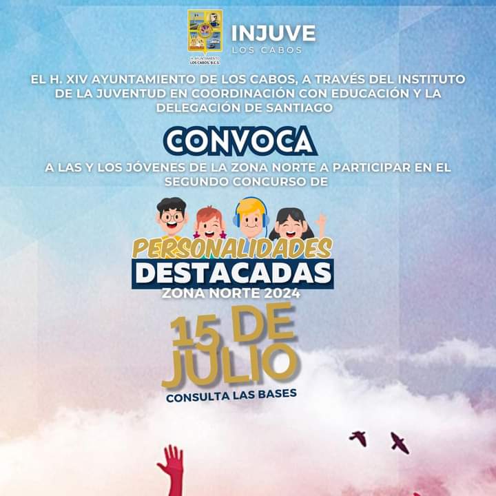 Los Cabos B.C.S., 17 de mayo del 2024.- Con el objetivo de reconocer y premiar el trabajo de la juventud cabeña en diferentes ámbitos, el Instituto de la Juventud del Municipio de Los Cabos (INJUVE), invita a las personas de 12 a 29 años de edad, residentes en la zona norte a participar en el concurso de “Personalidades Destacadas 2024”.
