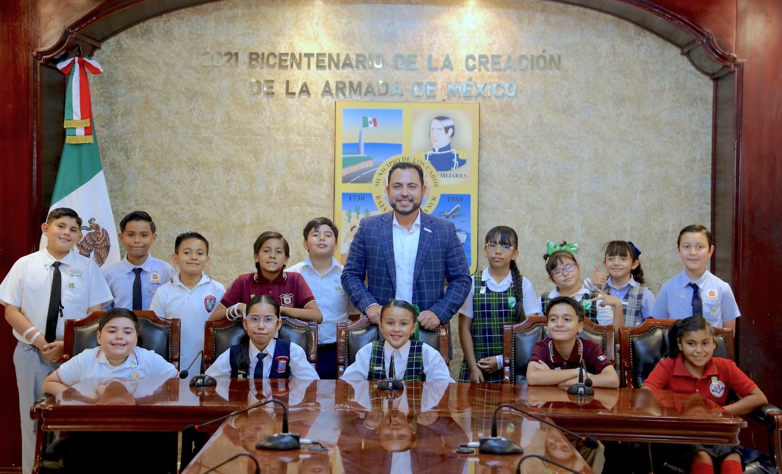 Al término del acto, las y los niños visitaron la sala de sesiones del Cabildo de Los Cabos, donde convivieron con el alcalde Christian Agúndez y el secretario general, Alberto Rentería Santana.