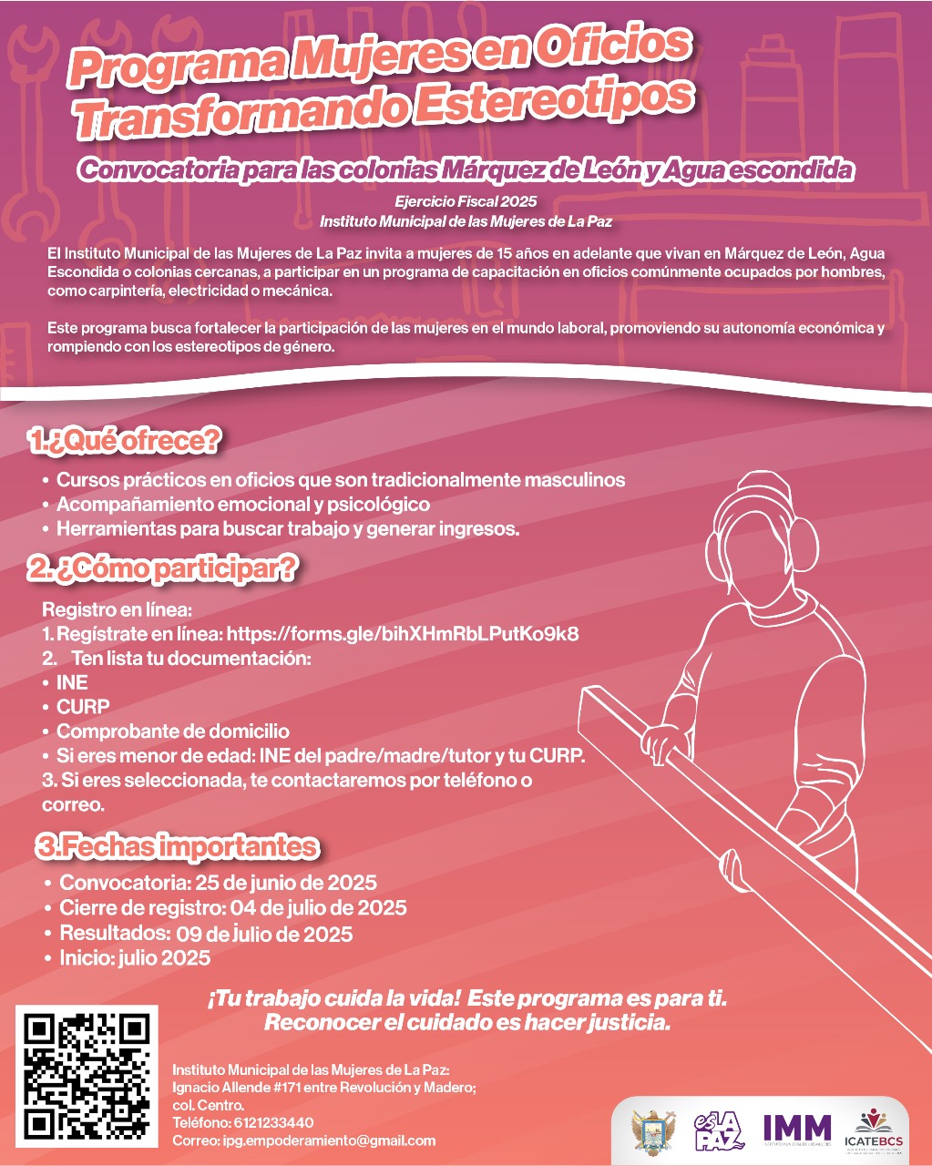 El Instituto Municipal de las Mujeres de La Paz (IMM), lanza a partir de este miércoles 25 de junio, la convocatoria para el Programa “Mujeres en oficios transformando estereotipos”, dirigida a quienes viven en las colonias Manuel Márquez de León, Agua Escondida y zonas aledañas.
