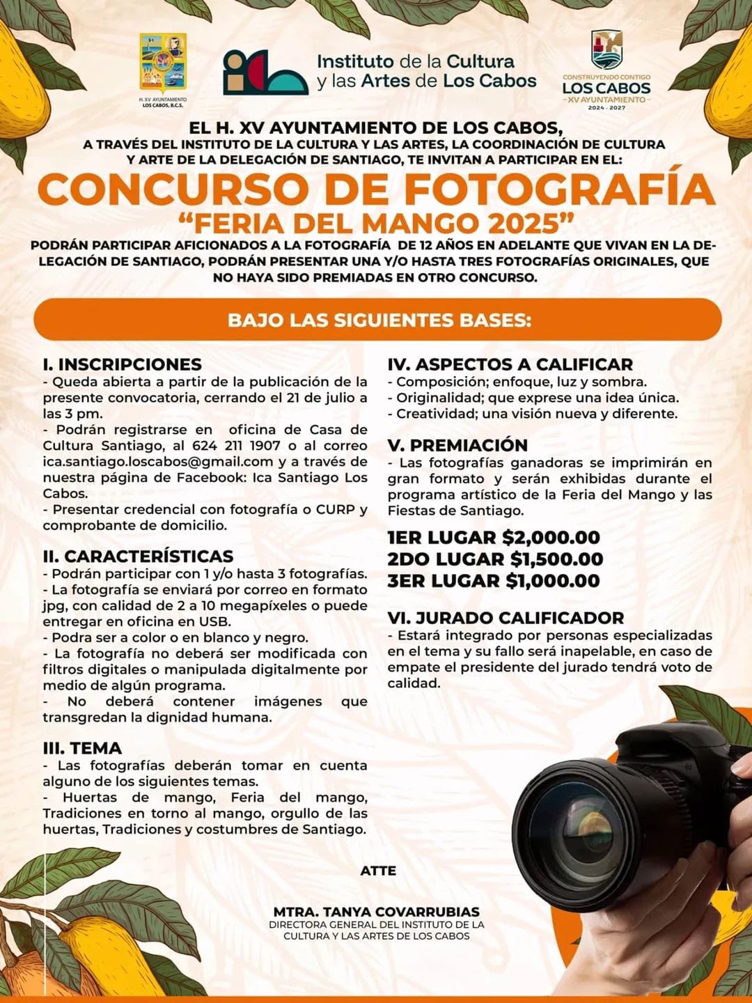 Los Cabos, Baja California Sur.- El XV Ayuntamiento de Los Cabos, a través del Instituto de la Cultura y las Artes (ICA), invita a la ciudadanía a participar en el concurso de fotografía que se realizará en el marco de la Feria del Mango 2025, en la delegación de Santiago.