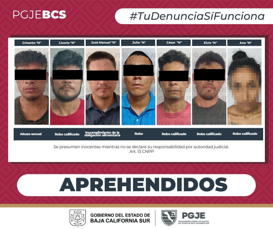 La PGJE ubicó y capturó a los probables responsables de delitos registrados en los municipios de Los Cabos, La Paz y Comondú.