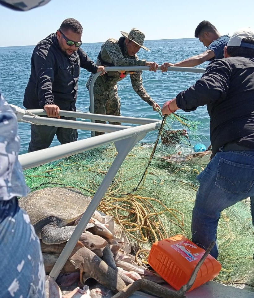 Es importante mencionar que dentro de las redes se encontraron 115 ejemplares, incluyendo tiburones y mantarrayas actualmente en veda temporal, además de dos tortugas marinas, logrando con ello liberar a todas las especies con vida.