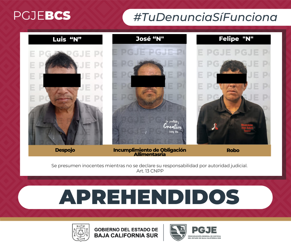 La Procuraduría General de Justicia del Estado (PGJE) de Baja California Sur, a través de agentes de investigación de la Unidad de Mandamientos Judiciales, cumplimentaron órdenes de aprehensión en contra de tres hombres relacionados con delitos cometidos en los municipios de Mulegé, Comondú y La Paz.