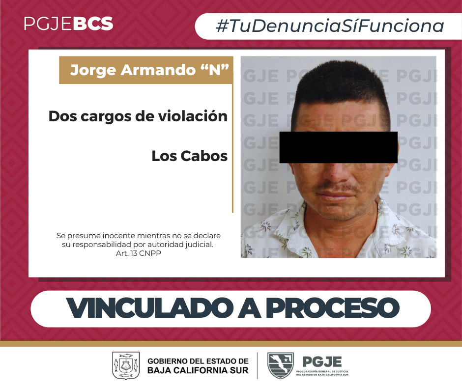Derivado de las investigaciones realizadas, la Procuraduría General de Justicia del Estado (PGJE) de Baja California Sur, logró la vinculación a proceso y la imposición de prisión preventiva en contra de Jorge Armando “N”, de 34 años, por su probable responsabilidad en la comisión de dos delitos de violación agravada en perjuicio de una adolescente.