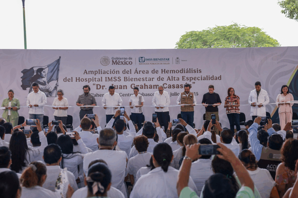 Villahermosa, Tabasco, a 19 de julio de 2025.- Desde Tabasco, la Presidenta de México, Claudia Sheinbaum Pardo, inauguró la ampliación del área de hemodiálisis del Hospital IMSS Bienestar de Alta Especialidad “Dr. Juan Graham Casasús” de Villahermosa y anunció una inversión adicional de 2 mil millones de pesos (mdp) para fortalecer el sistema de salud en esta entidad.