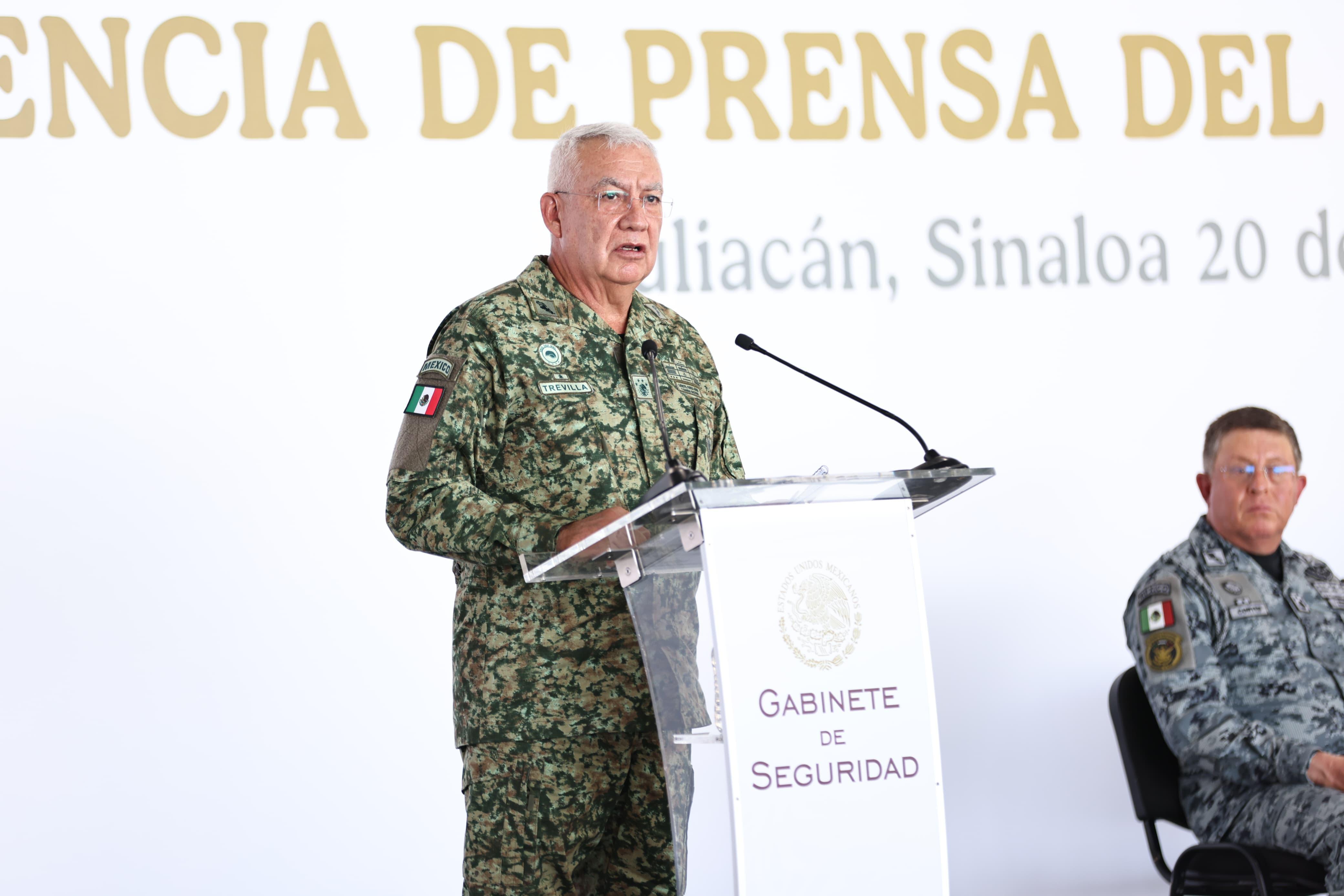 En la conferencia de prensa también estuvieron presentes el secretario de la Defensa Nacional, general Ricardo Trevilla Trejo; el secretario de Marina, almirante Raymundo Pedro Morales; el comandante de la Guardia Nacional, general Hernán Cortés Hernández; el secretario de Seguridad de Sinaloa, general Óscar Rentería Schazarino, y el Comandante de la Tercera Región Militar, general Guillermo Briseño Lobera.
