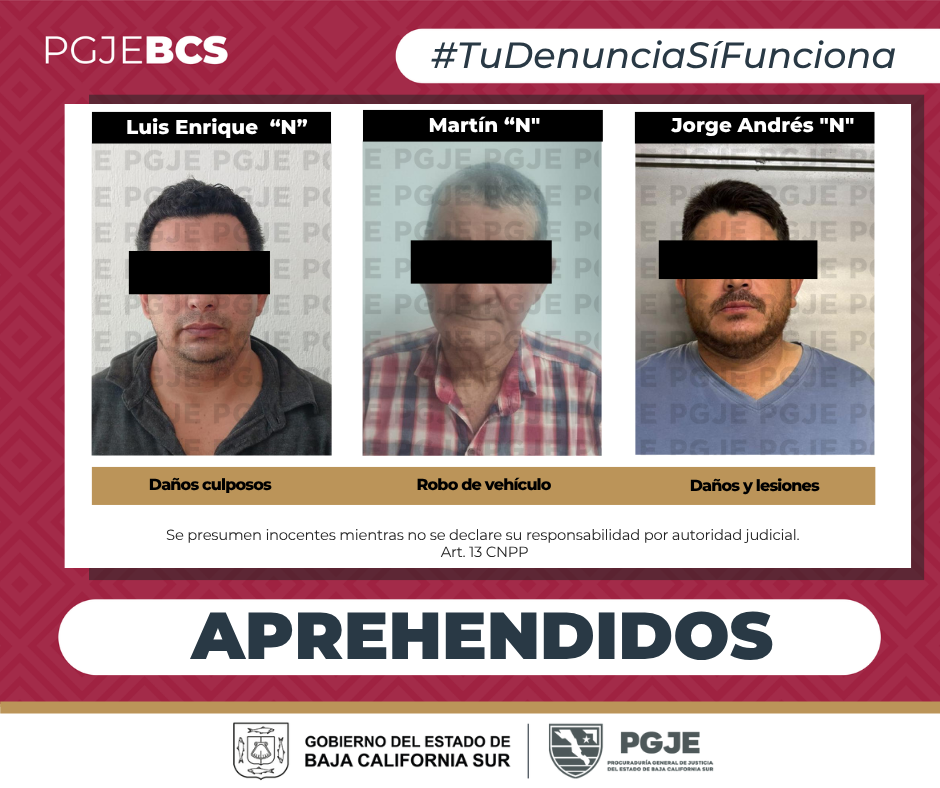Agentes de Investigación de la Procuraduría General de Justicia del Estado (PGJE), de Baja California Sur, realizaron operativos para aprehender a 3 personas del sexo masculino, por delitos de robo, daños y lesiones.