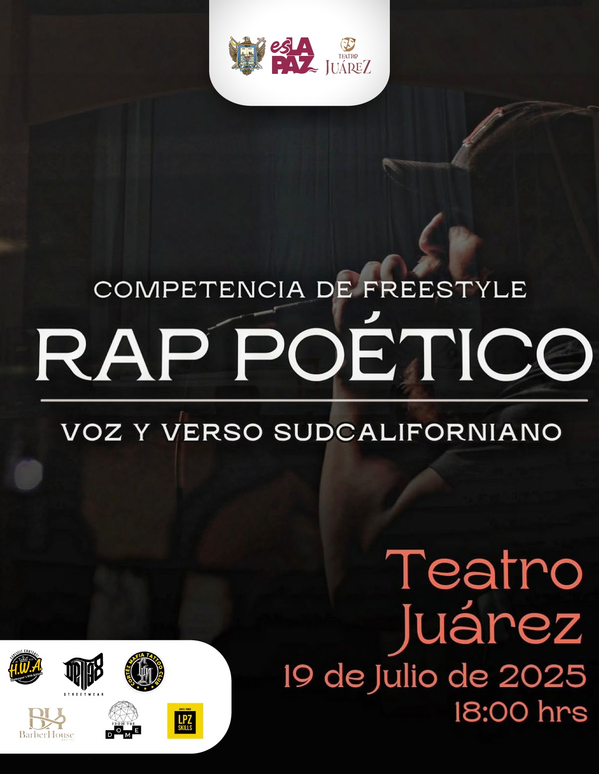 El sábado 19 de julio, a partir de las 18:00 horas se llevará a cabo la batalla de freestyle denominada Rap Poético, Voz y Verso Sudcaliforniano en el emblemático Teatro Juárez, así lo dio a conocer la directora del recinto, Marymar Osuna Espinoza.
