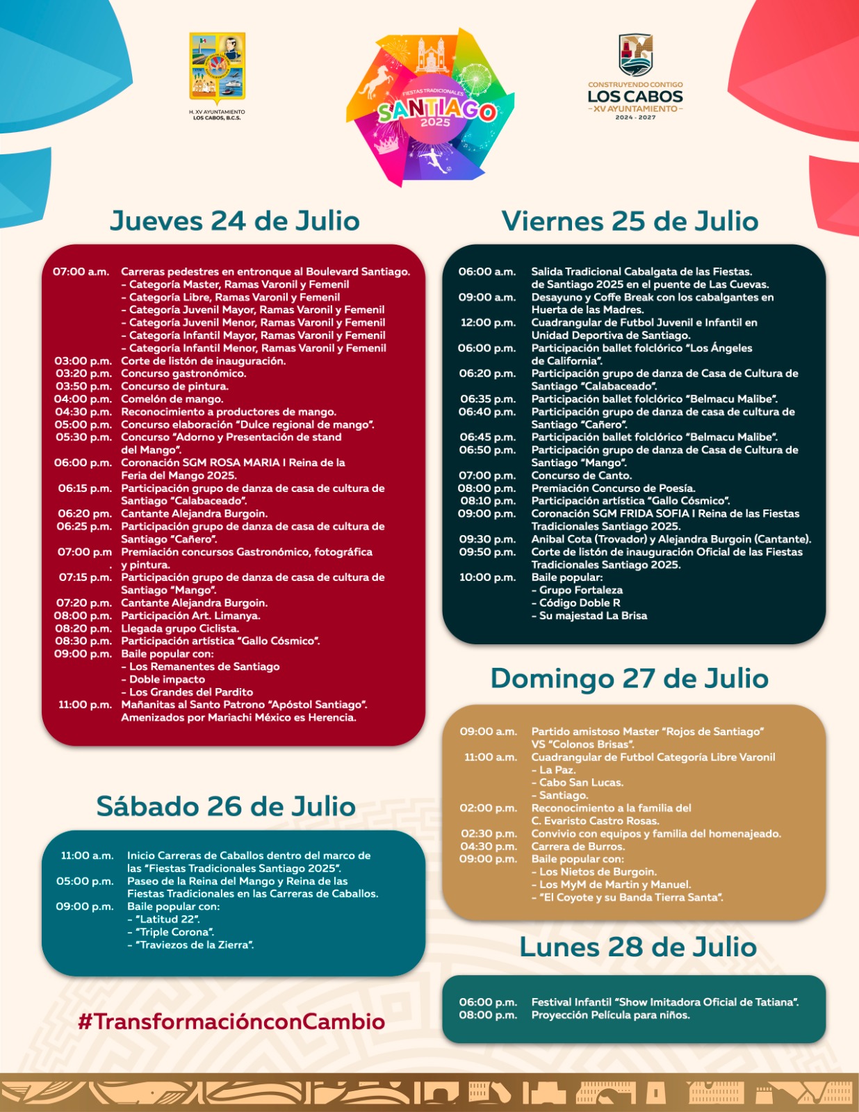 Los Cabos, Baja California Sur.– Con actividades que incluyen conciertos, concursos, cabalgatas, carreras y espectáculos familiares, el XV Ayuntamiento de Los Cabos que encabeza el presidente municipal, Christian Agúndez anunció el arranque de las Fiestas Tradicionales Santiago 2025, a celebrarse del 24 al 28 de julio en la Delegación de Santiago.
