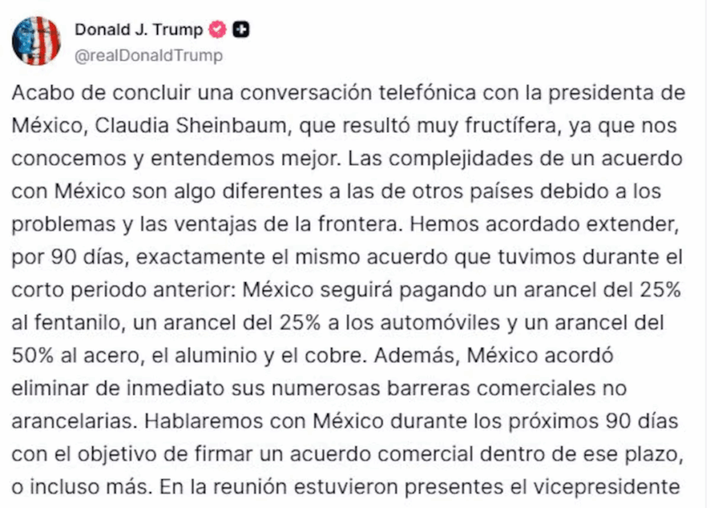 Por su parte, el presidente Donald Trump confirmó en su plataforma Truth Social que se mantendrán durante esos 90 días los aranceles actuales: