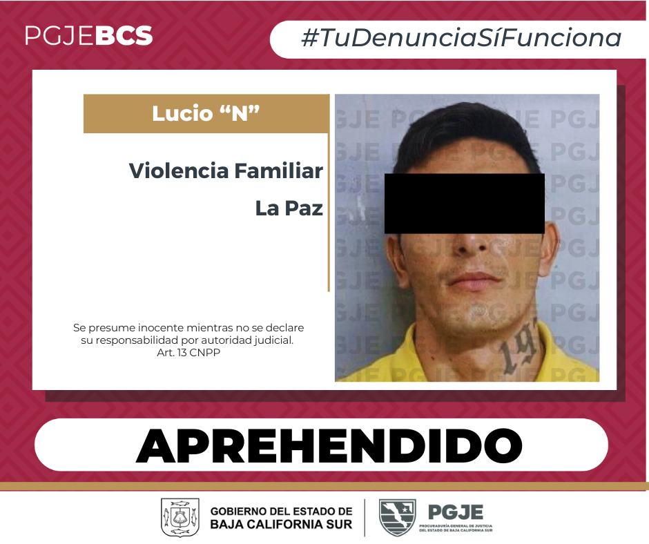 La Procuraduría General de Justicia del Estado (PGJE), por medio de la Unidad de Mandamientos Judiciales, cumplimentó una orden de aprehensión a un hombre de 25 años de edad, originario de La Paz, por su probable responsabilidad en el delito de violencia familiar.
