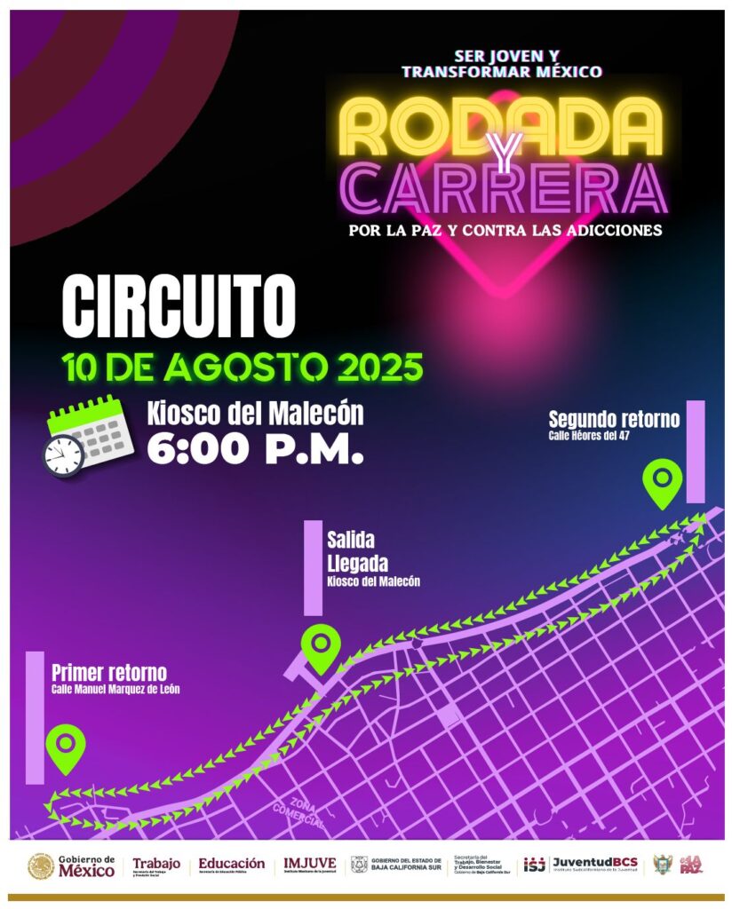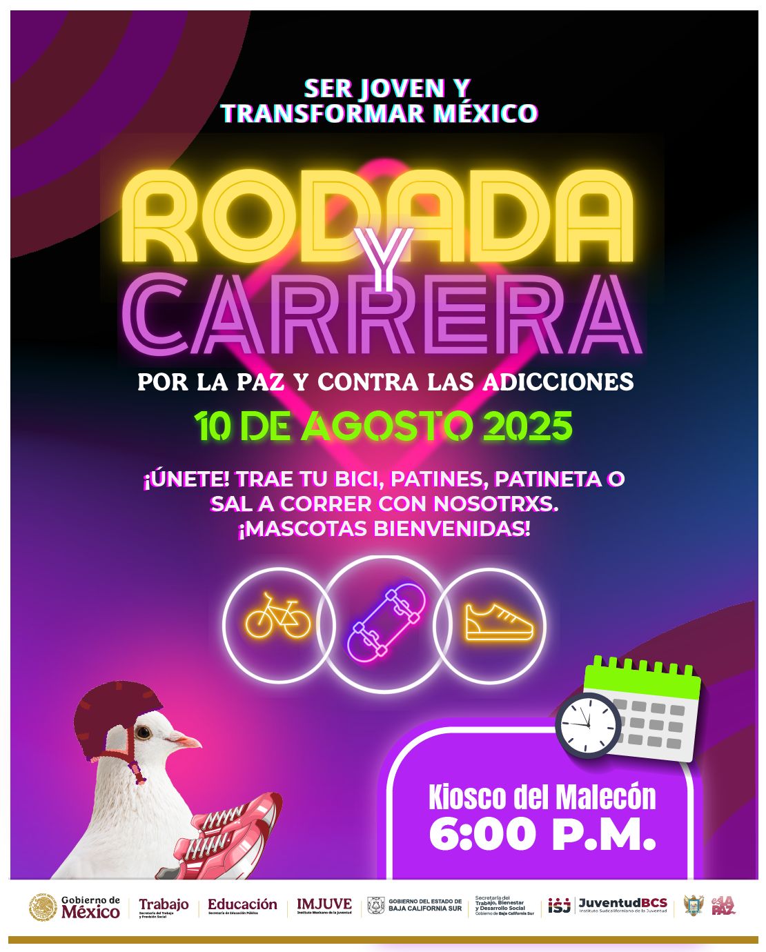 La Dirección Municipal de la Juventud de La Paz en coordinación con el Instituto Sudcaliforniano de la Juventud invitan a la ciudadanía a participar en la Rodada y Carrera por la Paz y contra las Adicciones, que se llevará a cabo el próximo 10 de agosto a las 6:00 de la tarde en el Malecón de la ciudad.