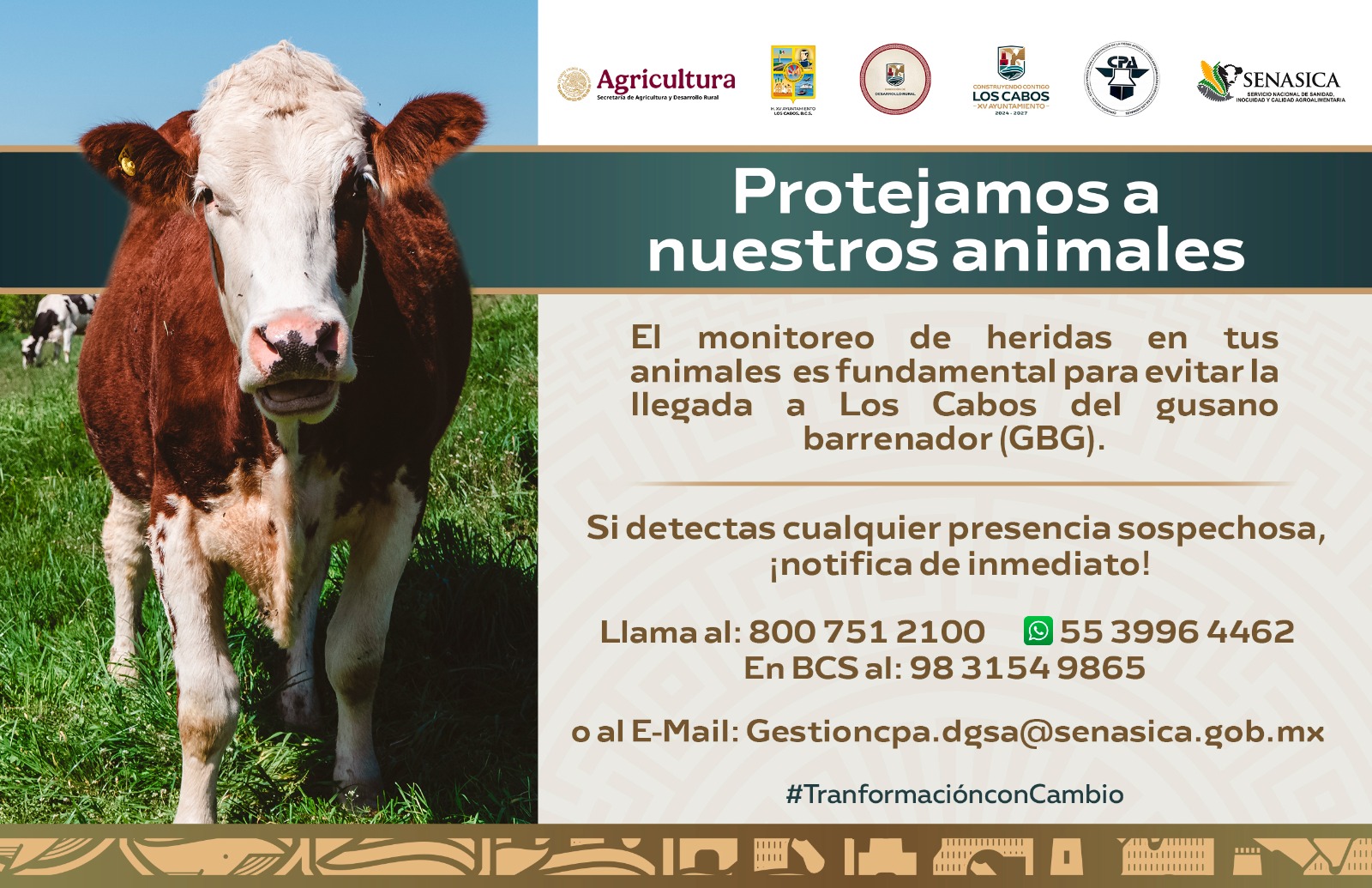 En su mensaje, el titular de la dependencia, Raúl Montaño hizo el llamado, “queremos hacerle un atento aviso sobre el gusano barrenador (GBG), de manera preventiva, si ven en las heridas moscas y gusano de cualquier tipo, es importante avisar a los números: 800 751 2100; 983 154 9865; al whatsapp 55 3996 4462 o al correo gestioncpa.dgsa@senasica.gob.mx”.