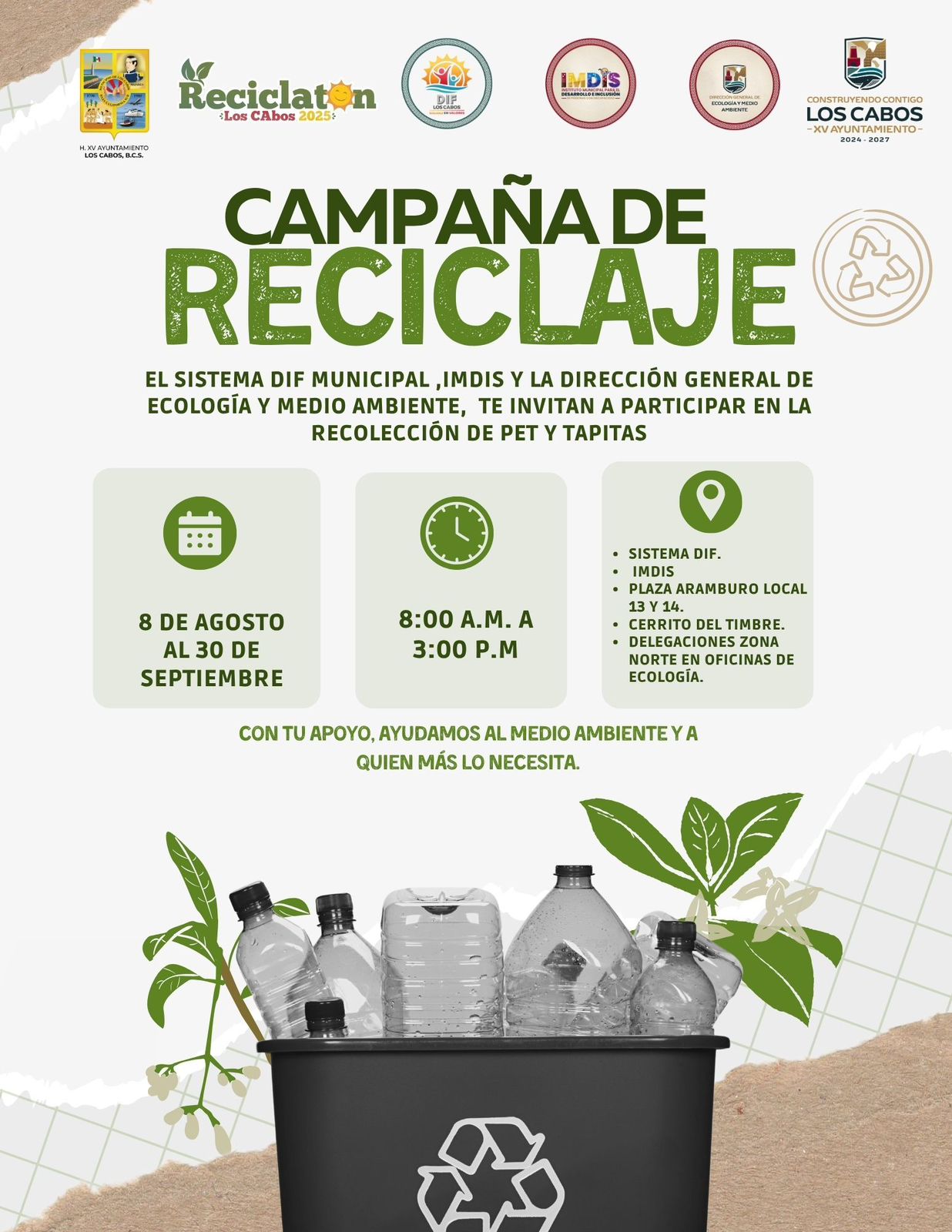 Cruz Ocampo, indicó que la campaña, que se desarrolla del 08 de agosto hasta el 30 de septiembre, por tal motivo hizo extensiva la invitación a la ciudadanía a reunir y entregar materiales reciclables en diversos puntos de acopio en Los Cabos; tales como botellas, envases de PET, taparroscas, plástico rígido, latas de aluminio, así como papel y cartón limpios. Los centros de recolección están ubicados en el Sistema DIF Los Cabos, IMDIS, Plaza Arámburo, Cerrito del Timbre y las oficinas de Ecología en las delegaciones de la Zona Norte, en un horario de 08:00 a.m. a 3:00 p.m.