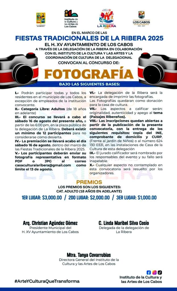 Los Cabos, Baja California Sur.- El XV Ayuntamiento de Los Cabos, invita a la comunidad en general a participar en dos eventos que destacan la identidad y el talento local, se trata del tradicional Concurso de Machaca de Pescado con Camote y el Concurso de Fotografía “Paisajes Ribereños”, organizados en el marco de las Fiestas Tradicionales de La Ribera 2025, a través de la Delegación Municipal de La Ribera y el Instituto de la Cultura y las Artes (ICA).