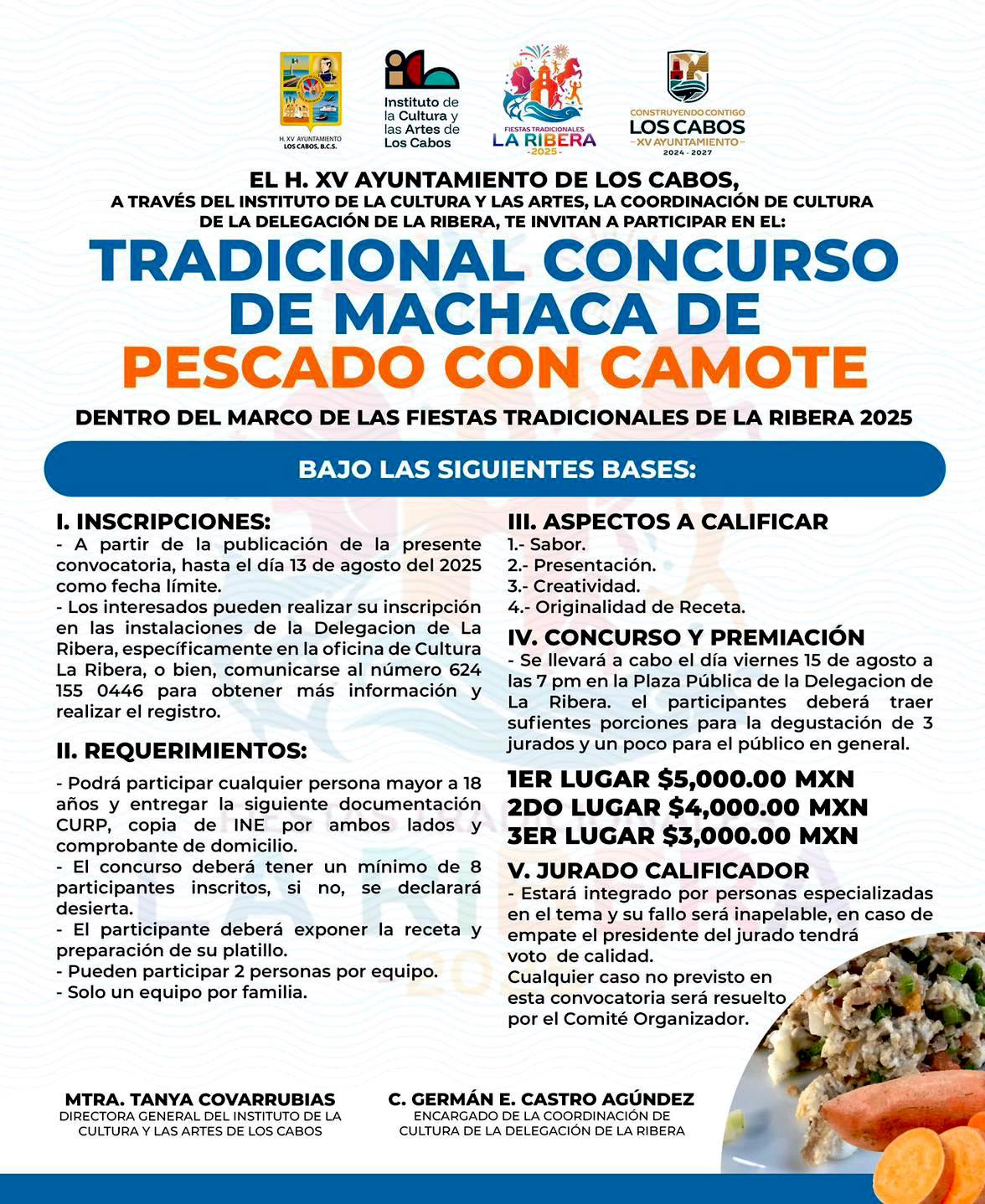 Los Cabos, Baja California Sur.- El XV Ayuntamiento de Los Cabos, invita a la comunidad en general a participar en dos eventos que destacan la identidad y el talento local, se trata del tradicional Concurso de Machaca de Pescado con Camote y el Concurso de Fotografía “Paisajes Ribereños”, organizados en el marco de las Fiestas Tradicionales de La Ribera 2025, a través de la Delegación Municipal de La Ribera y el Instituto de la Cultura y las Artes (ICA).