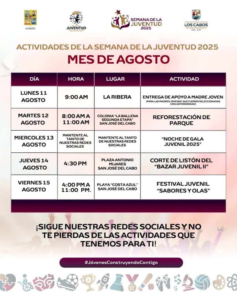 Los Cabos, Baja California Sur.– El Instituto de la Juventud de Los Cabos invita a participar en la Semana de la Juventud 2025, una agenda especial para conmemorar el Día Mundial de la Juventud con actividades culturales, ambientales y recreativas.