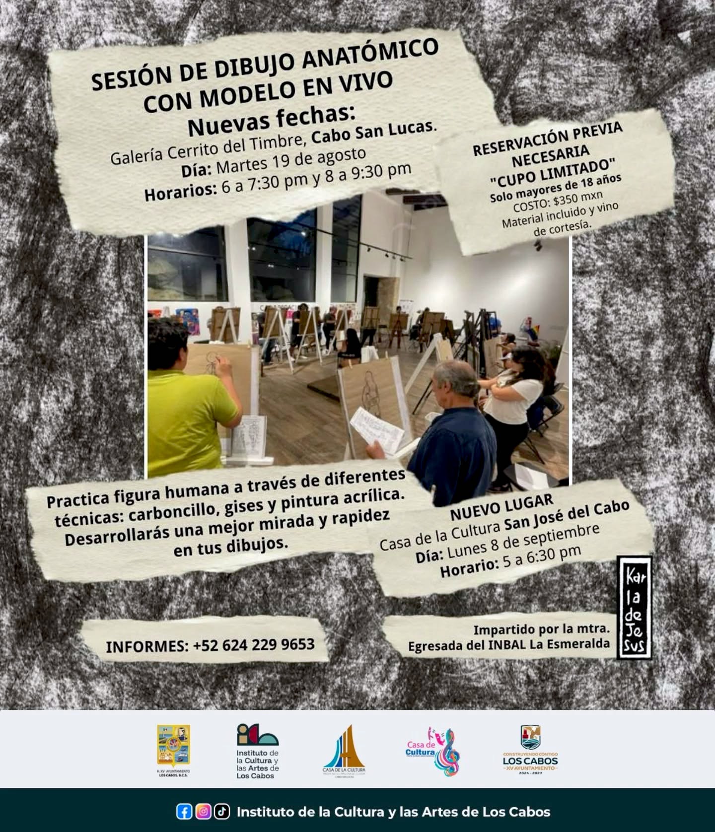 Los Cabos, Baja California Sur.- El Instituto de la Cultura y las Artes (ICA) a través de la Casa de la Cultura “Profa. Nieves Trasviña de Ceseña” de Cabo San Lucas y la Casa de la Cultura “Prof. Alfredo Green González” en San José del Cabo, invita a la sesión de “Dibujo Anatómico” con modelo en vivo. Esta actividad permite practicar la figura humana utilizando diferentes técnicas, para ayudar a desarrollar una mirada más afinada y mayor rapidez en la creación de dibujos, observando el cuerpo humano con naturalidad a través del arte.