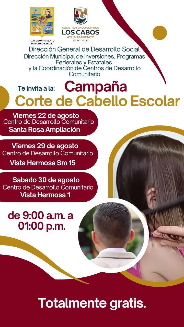 Los Cabos, Baja California Sur.- Con el objetivo de apoyar la economía familiar en este regreso a clases, el XV Ayuntamiento de Los Cabos, a través de la Dirección General de Desarrollo Social, Dirección Municipal de Inversiones, Programas Federales y Estatales y la Coordinación de Centros de Desarrollo Comunitario, llevará a cabo la campaña gratuita de corte de cabello escolar en diferentes colonias de San José del Cabo.