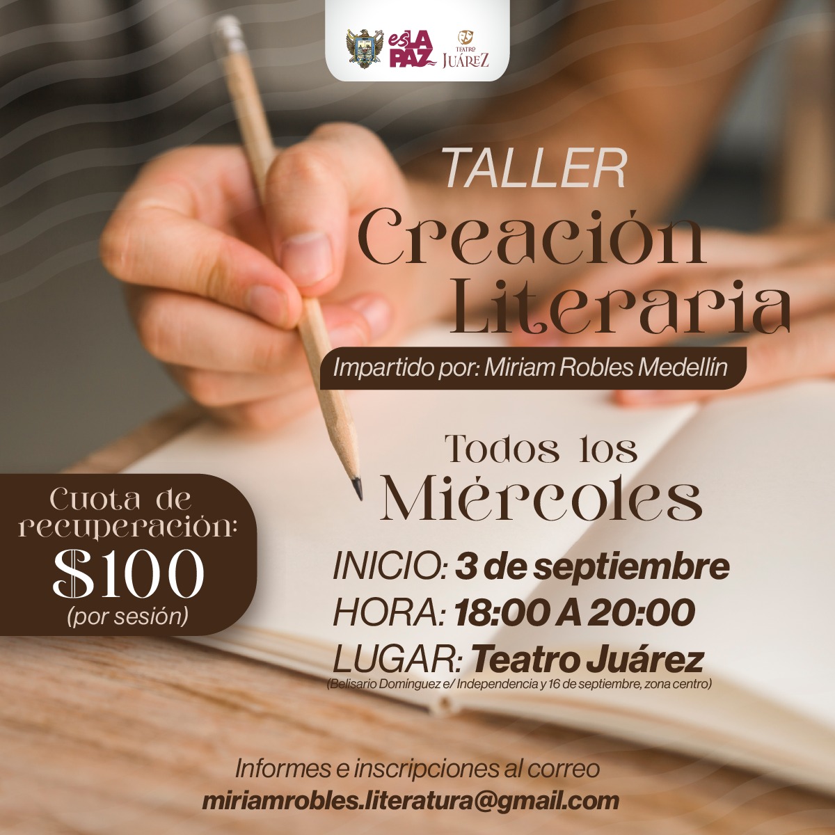 El H. XVIII Ayuntamiento de La Paz, a través de la Dirección Municipal de Cultura, invita a todas las personas interesadas al taller de creación literaria que se desarrollará en el Teatro Juárez a partir del próximo miércoles 3 de septiembre, dio a conocer la directora del recinto, Marymar Osuna Espinoza.