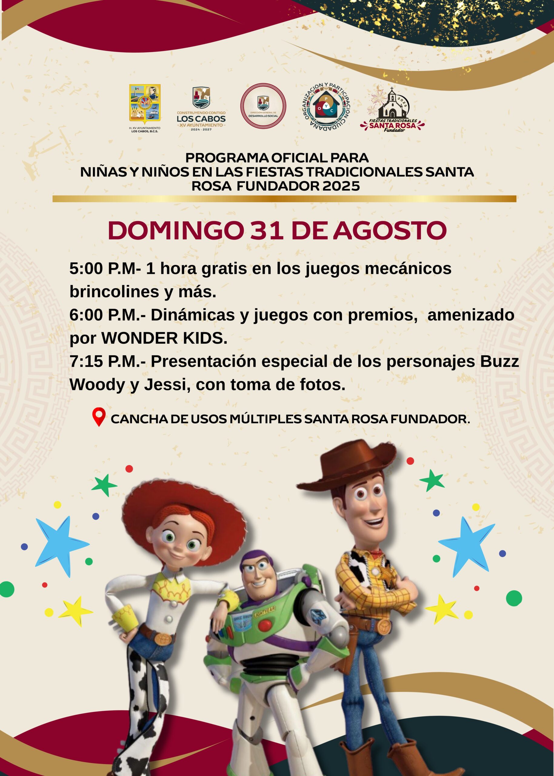 Los Cabos, Baja California Sur.- XV Ayuntamiento de Los Cabos da a conocer que este domingo 31 de agosto, en el marco de las Fiestas Tradicionales Santa Rosa Fundador 2025, se desarrollará un programa especial dirigido a la niñez, con actividades gratuitas y espectáculos pensados para fomentar la convivencia familiar.