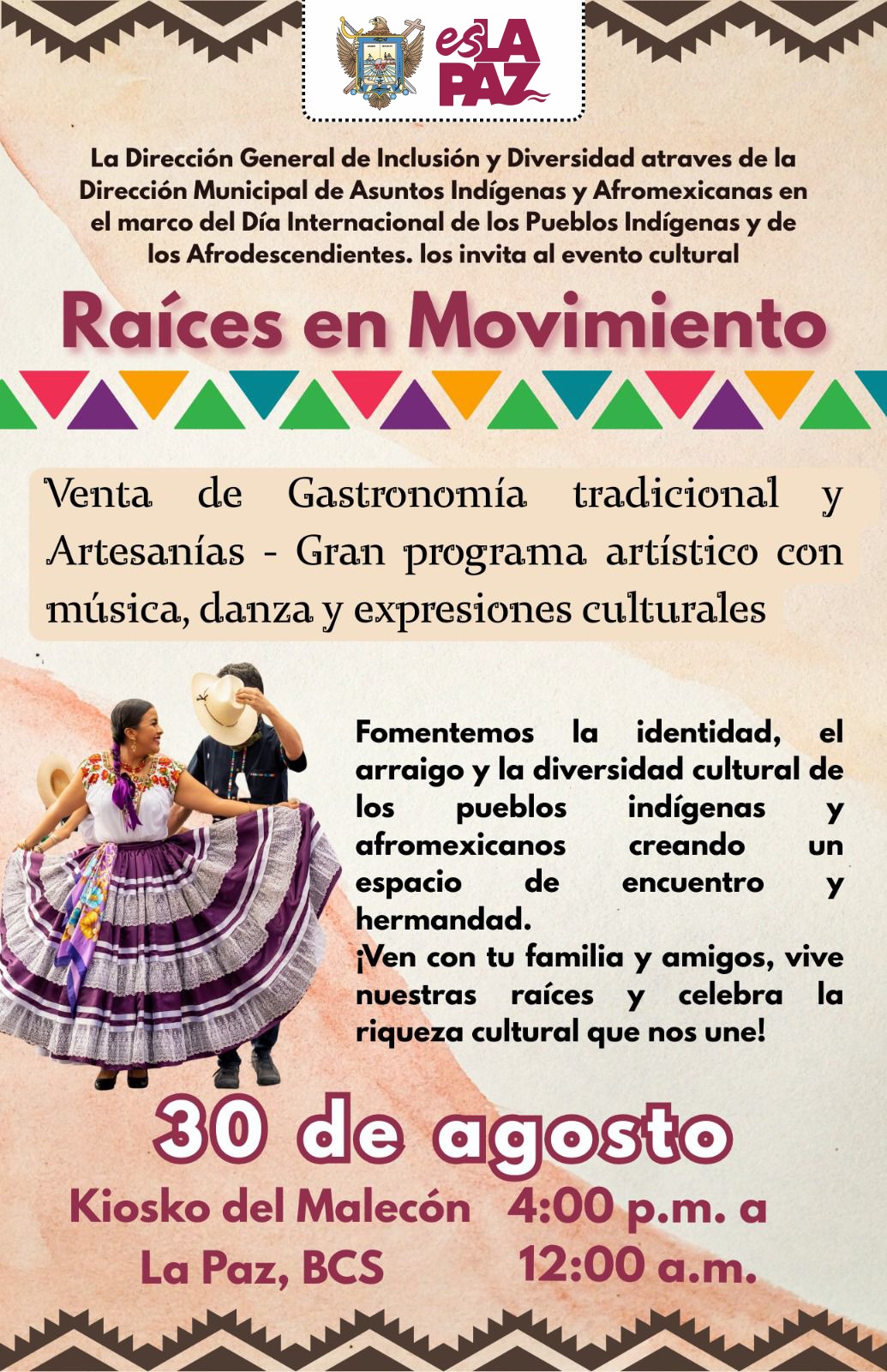 El Ayuntamiento de La Paz, a través de la Dirección General de Inclusión y Diversidad, bajo la coordinación operativa de la Dirección Municipal de Asuntos Indígenas y Afromexicanos, en el marco del Día Internacional de los Pueblos Indígenas, invitan al festival cultural Raíces en Movimiento.