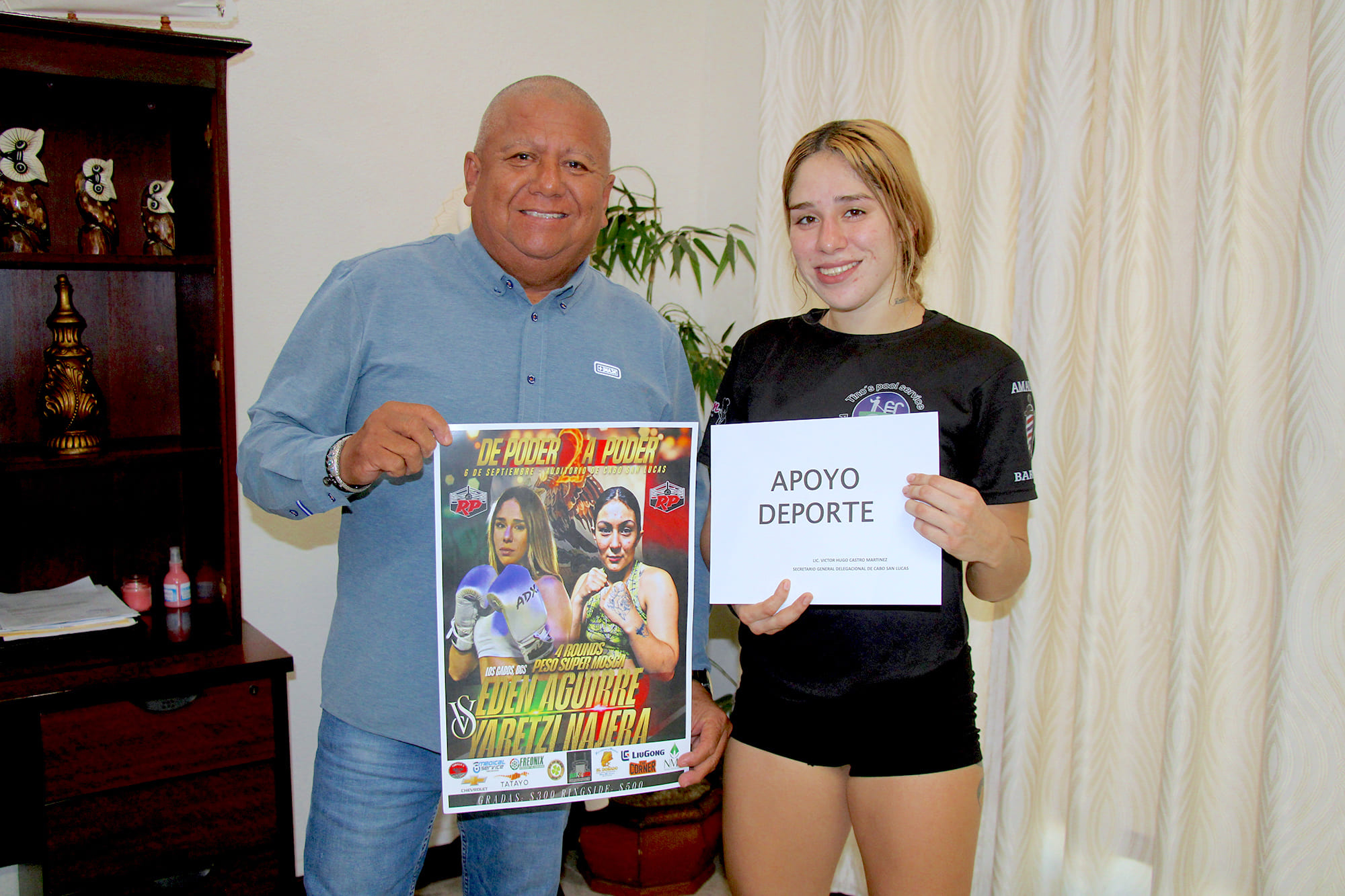 Los Cabos, Baja California Sur.- En representación de la delegada de Cabo San Lucas Karina de la O Uribe, el coordinador de la Secretaría General, Víctor Castro Martínez recibió a la boxeadora profesional Edén Inairam Villavicencio Aguirre, conocida como “La Muñeca”, a quien entregó un apoyo económico para su preparación física de cara a su próxima pelea que se llevará a cabo el sábado 06 de septiembre.