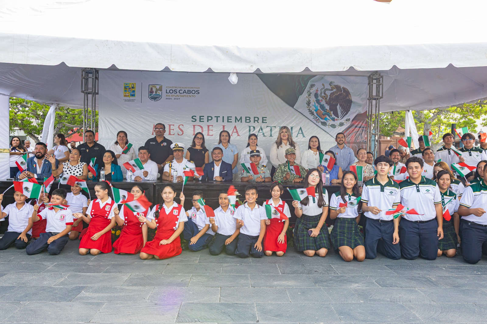 Los Cabos, Baja California Sur.- Con la ceremonia de honores a la bandera, el XV Ayuntamiento de Los Cabos que preside Christian Agúndez Gómez, este lunes 01 de septiembre dio inicio formal a las actividades cívicas y culturales del Mes Patrio, contando con la presencia de autoridades municipales, personas servidoras públicas e  integrantes de fuerzas armadas.