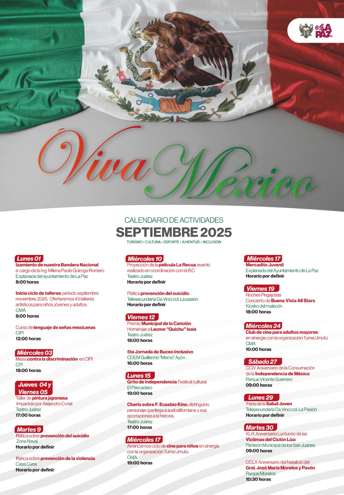 El gobierno municipal de La Paz, a través de la Dirección General de Inclusión y Diversidad, da a conocer la agenda de actividades que se desarrollarán durante el mes de septiembre como parte de la conmemoración del aniversario de la Independencia de México.
