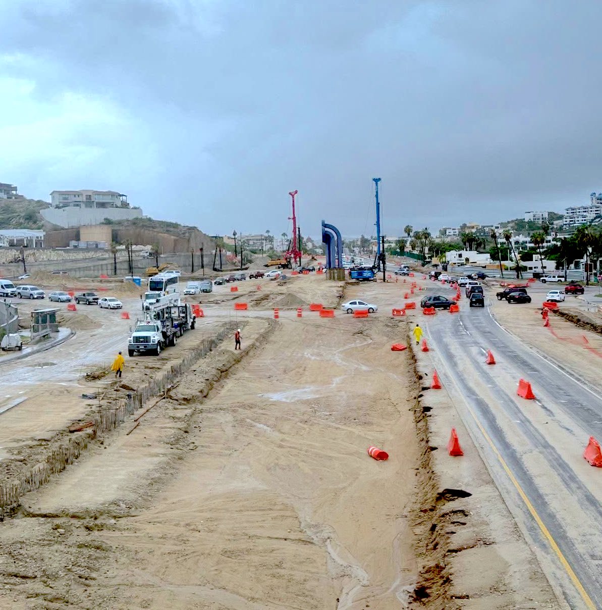 Los Cabos, Baja California Sur.- El titular de la Dirección General de Desarrollo Urbano, Roberto Flores Rivera, informó, que, si bien el tránsito vehicular donde se realizan los trabajos de construcción en la glorieta de Fonatur opera de manera normal, debido a las precipitaciones presentadas este jueves 04 de septiembre, se realizó el cierre parcial de uno de los carriles de circulacion.