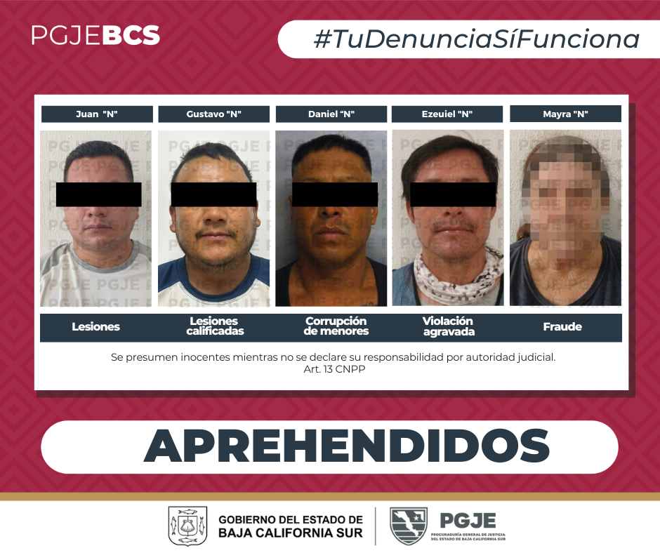 La Procuraduría General de Justicia del Estado (PGJE), realizó operativos mediante los cuales, aprehendió a 5 personas, 4 del sexo masculino y una mujer, en seguimiento a investigaciones por denuncias de actividades ilícitas.