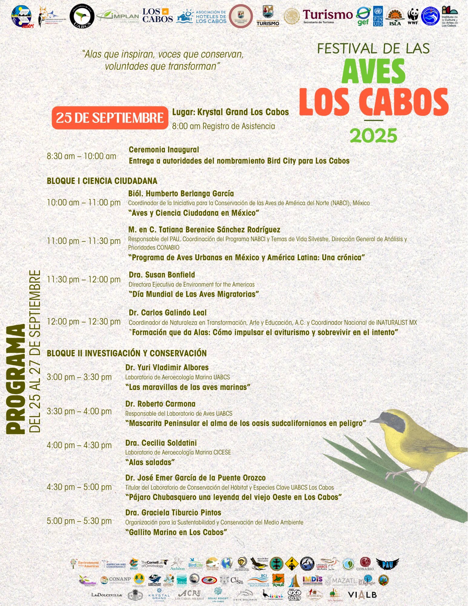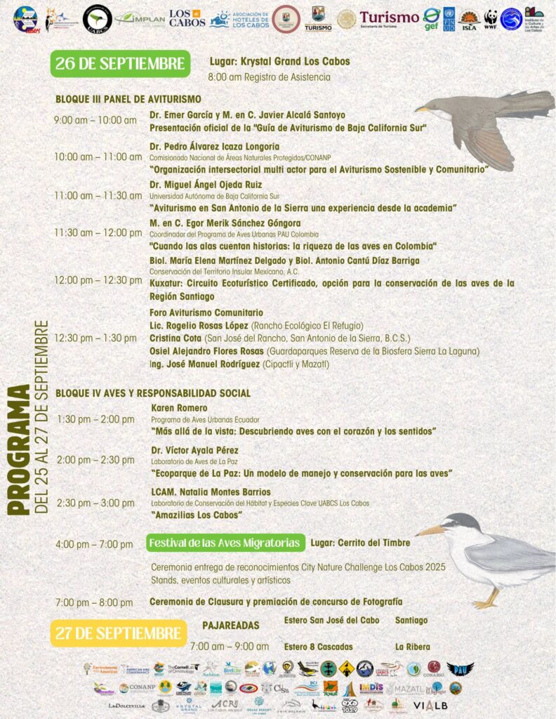 El programa contempla actividades de gran relevancia, entre ellas la entrega de la designación internacional de Los Cabos como Bird City, conferencias con expertos nacionales e internacionales, la presentación de la Guía de Aviturismo de Baja California Sur, así como paneles sobre conservación y turismo sostenible. También se realizarán actividades culturales, artísticas y pajareadas abiertas al público.