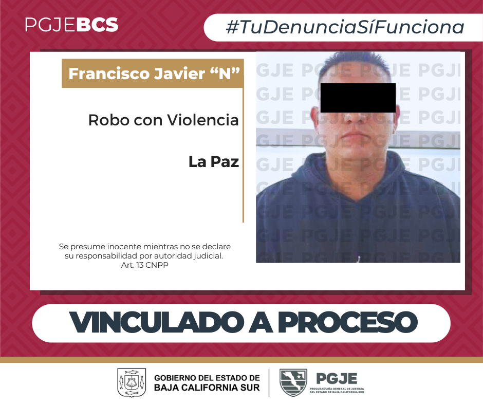 La Procuraduría General de Justicia del Estado (PGJE) logró que un Juez de Control dictara auto de vinculación a proceso y prisión preventiva en contra de Francisco Javier “N” relacionado con la comisión del delito de robo cometido por dos personas armadas con violencia en las cosas.