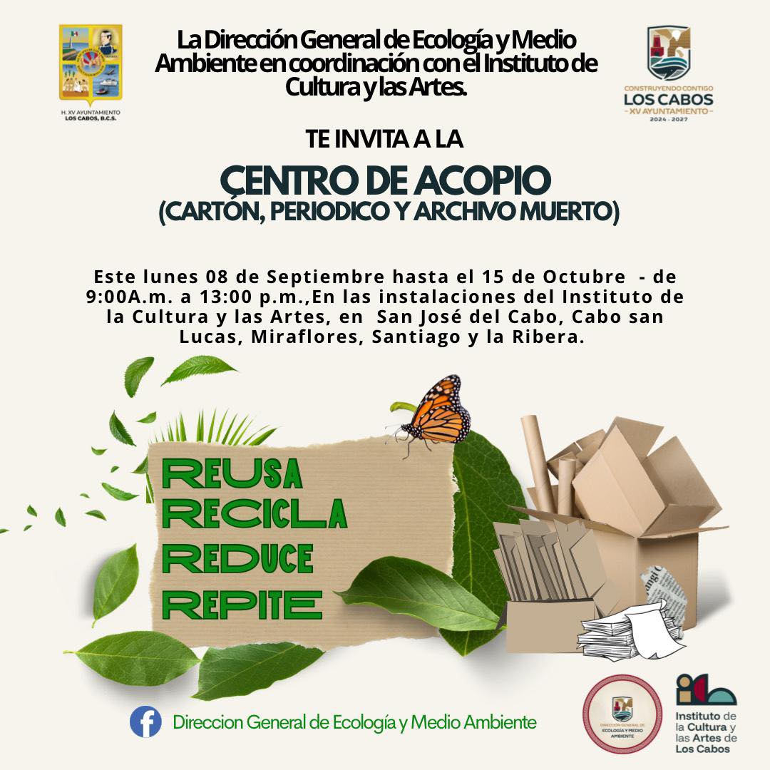 La directora general de Ecología y Medio Abiente Natali Cruz Ocampo, informó que como parte de este esfuerzo conjunto, se instalará un Centro de Acopio para la recolección de cartón, periódico y archivo muerto, mismo que permanecerá como receptor desde el lunes 08 de septiembre hasta el miércoles 15 de octubre, en un horario de 09:00 de la mañana a 01:00 de la tarde, en las instalaciones ICA que se ubican en San José del Cabo, Cabo San Lucas, Miraflores, Santiago y La Ribera.