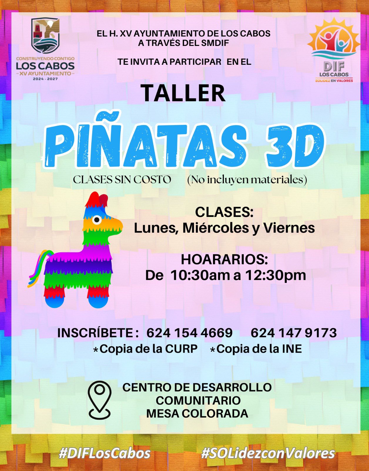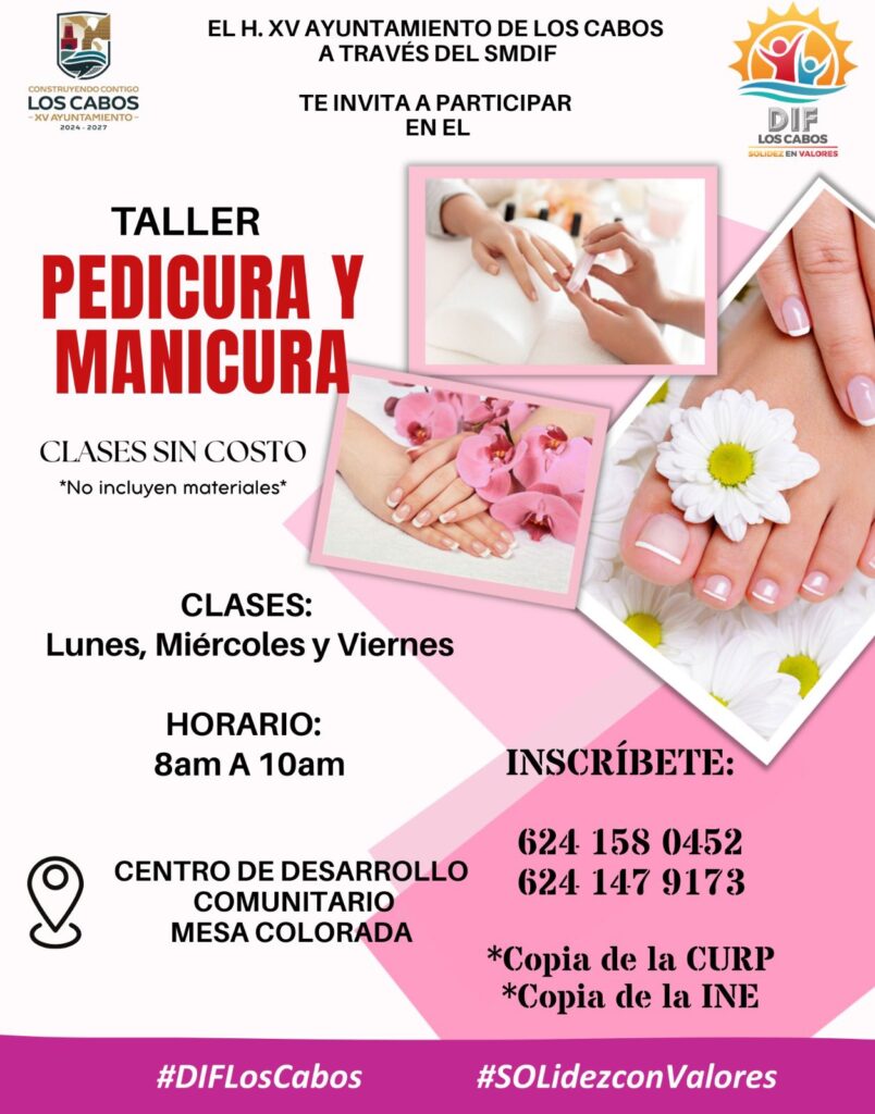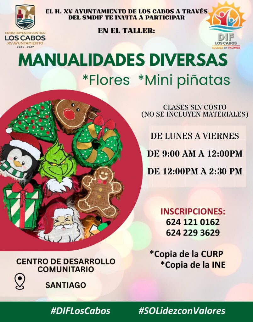 Los Cabos, Baja California Sur.- El H. XV Ayuntamiento de Los Cabos, a través del Sistema DIF, invita a la comunidad a participar en una serie de talleres gratuitos que se impartirán en distintos Centros de Desarrollo Comunitario del municipio. Entre las actividades destacan cursos de manualidades, elaboración de piñatas, flores, así como pedicura y manicura, los cuales están diseñados para fomentar habilidades prácticas y ofrecer espacios de convivencia y aprendizaje.