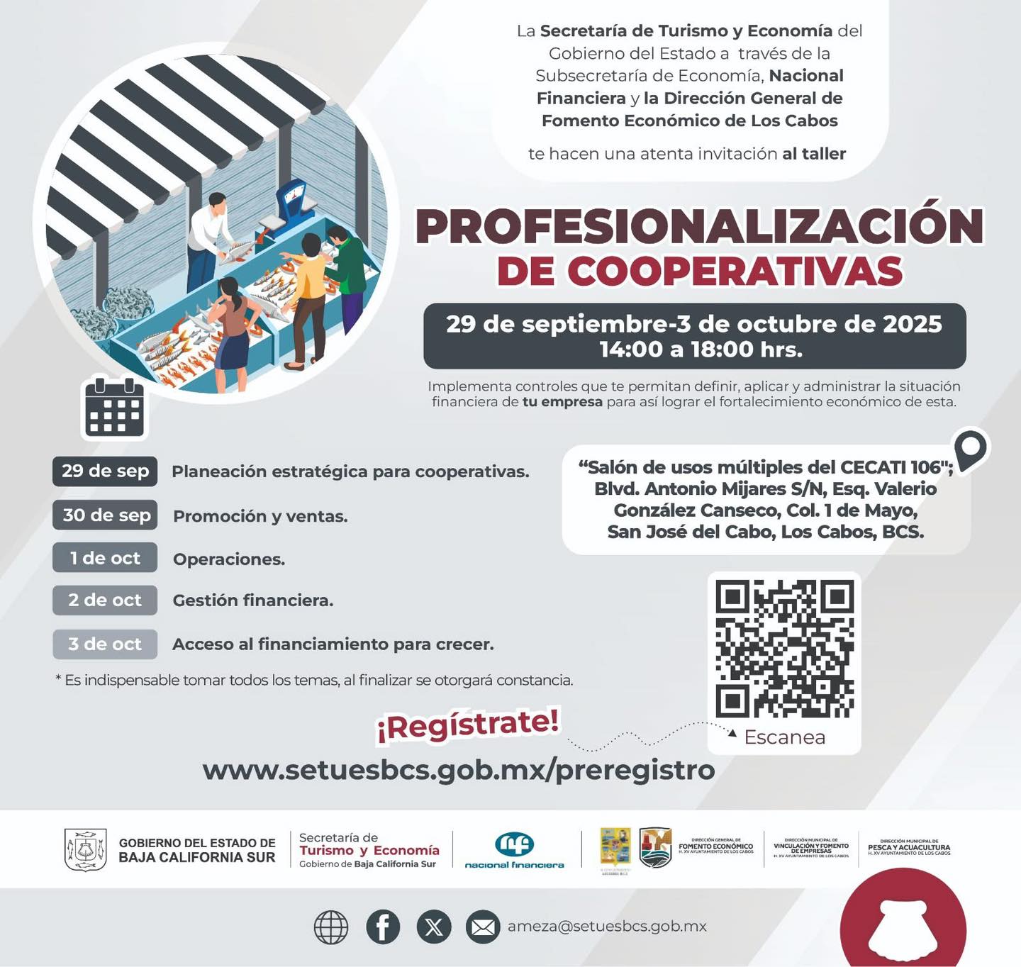 Con el objetivo de fortalecer las capacidades administrativas y financieras de las cooperativas en Baja California Sur, la Secretaría de Turismo y Economía (SETUE), en coordinación con Nacional Financiera y la Dirección General de Fomento Económico de Los Cabos, llevará a cabo un taller de “Profesionalización de Cooperativas”.