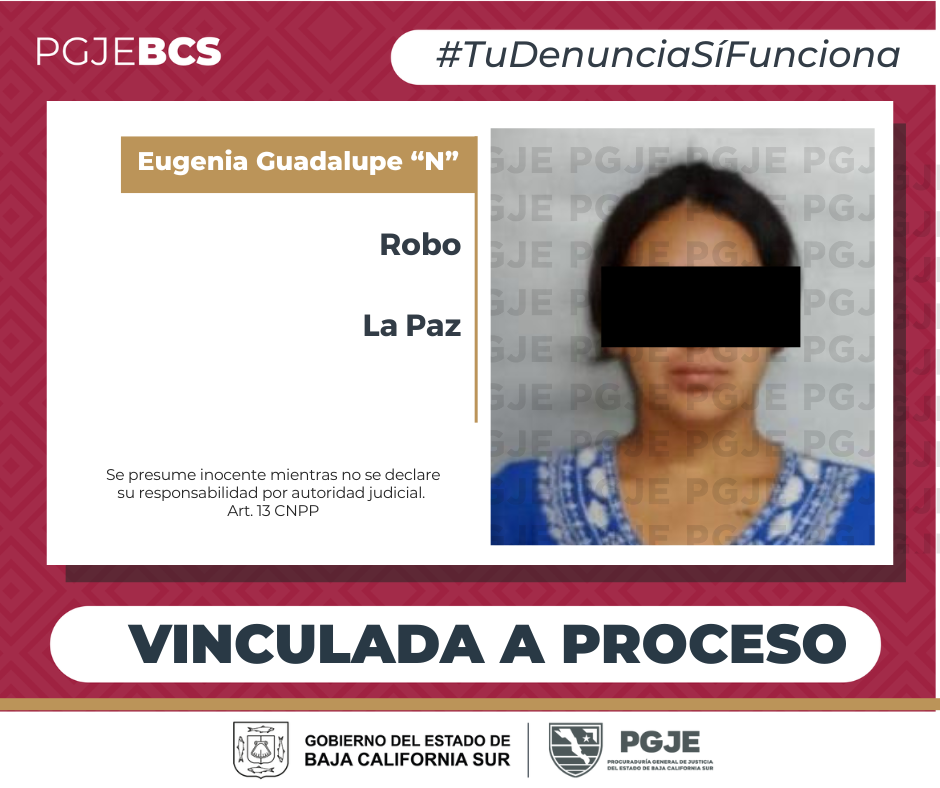 La Procuraduría General de Justicia del Estado (PGJE) logró que un Juez de Control dictara auto de vinculación a proceso en contra de Eugenia Guadalupe “N”, relacionada con la comisión del delito de robo calificado cometido contra persona mayor de 60 años y robo de vehículo.