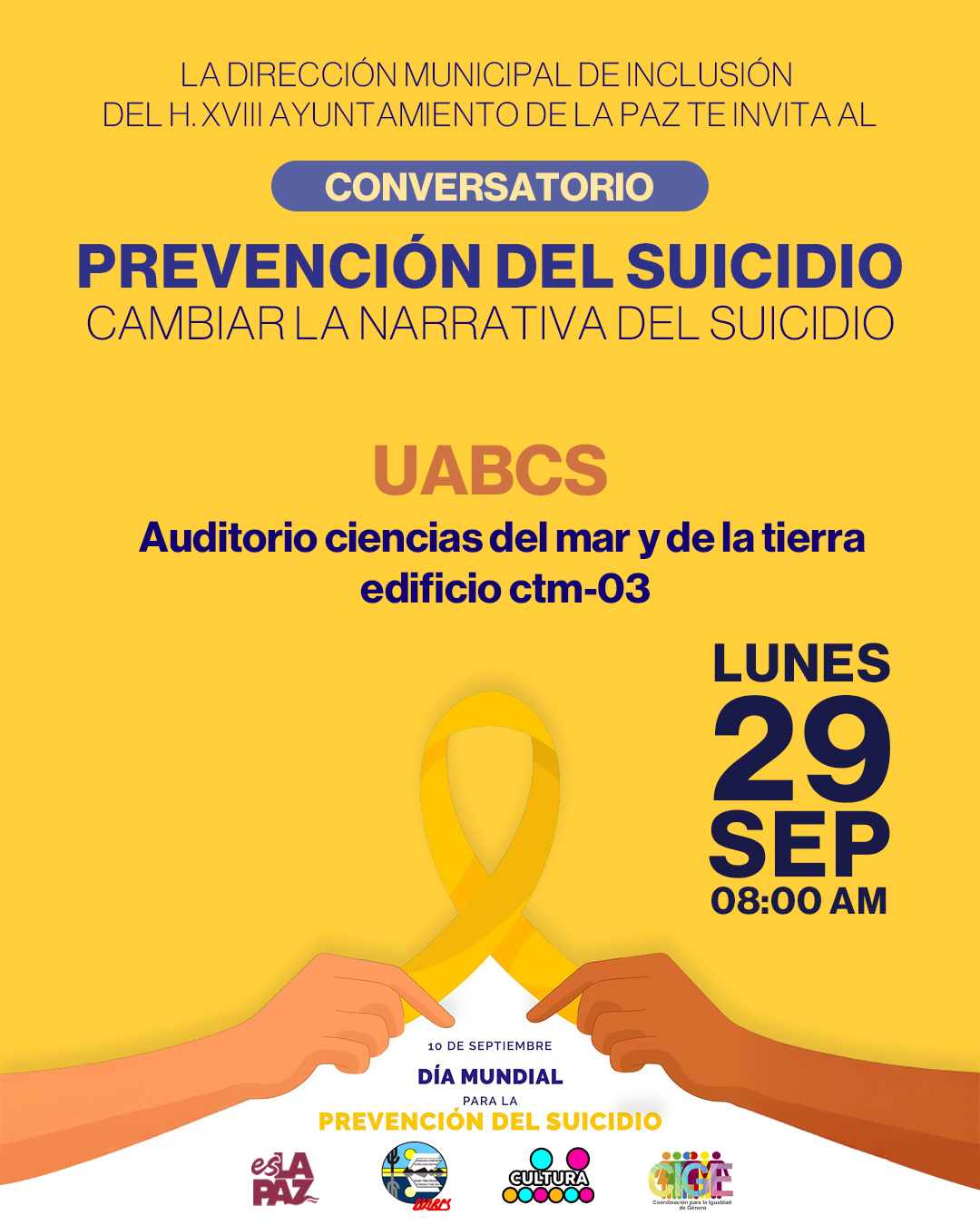 En el marco del Día Mundial de la Prevención del Suicidio, la Dirección Municipal de Inclusión extiende la invitación general al Conversatorio “Prevención del Suicidio: Cambiar la narrativa del suicidio”, que se realizará el próximo lunes 29 de septiembre a las 8:00 de la mañana en el auditorio de Ciencias del Mar y de la Tierra (Edificio CTM-03) de la Universidad Autónoma de Baja California Sur.