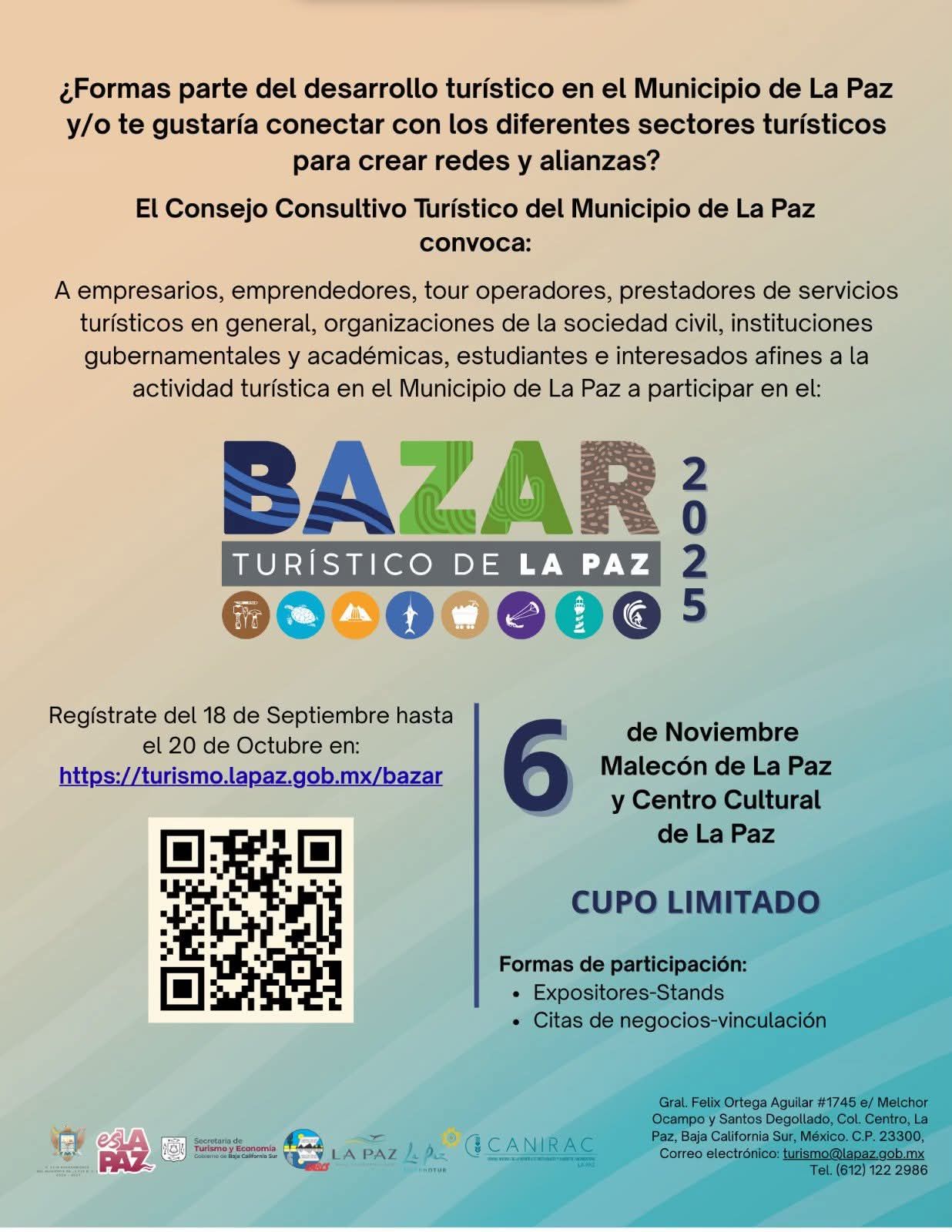 El registro estará disponible hasta el 20 de octubre a través del sitio web https://turismo.lapaz.gob.mx/bazar. Para más información, los interesados pueden comunicarse a la Dirección de Turismo Municipal al teléfono (612) 122 2986 o al correo electrónico turismo@lapaz.gob.mx.