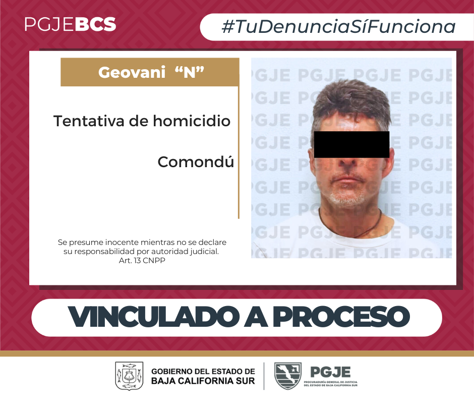 El agente del Ministerio Público Unidad de Investigación del Delitos Diversos de la Procuraduría General de Justicia del Estado (PGJE) obtuvo la vinculación a proceso de Geovani “N” imputado por homicidio doloso en grado de tentativa inacabada, que probablemente cometió la tarde del 7 de febrero del 2024 en Puerto San Carlos.