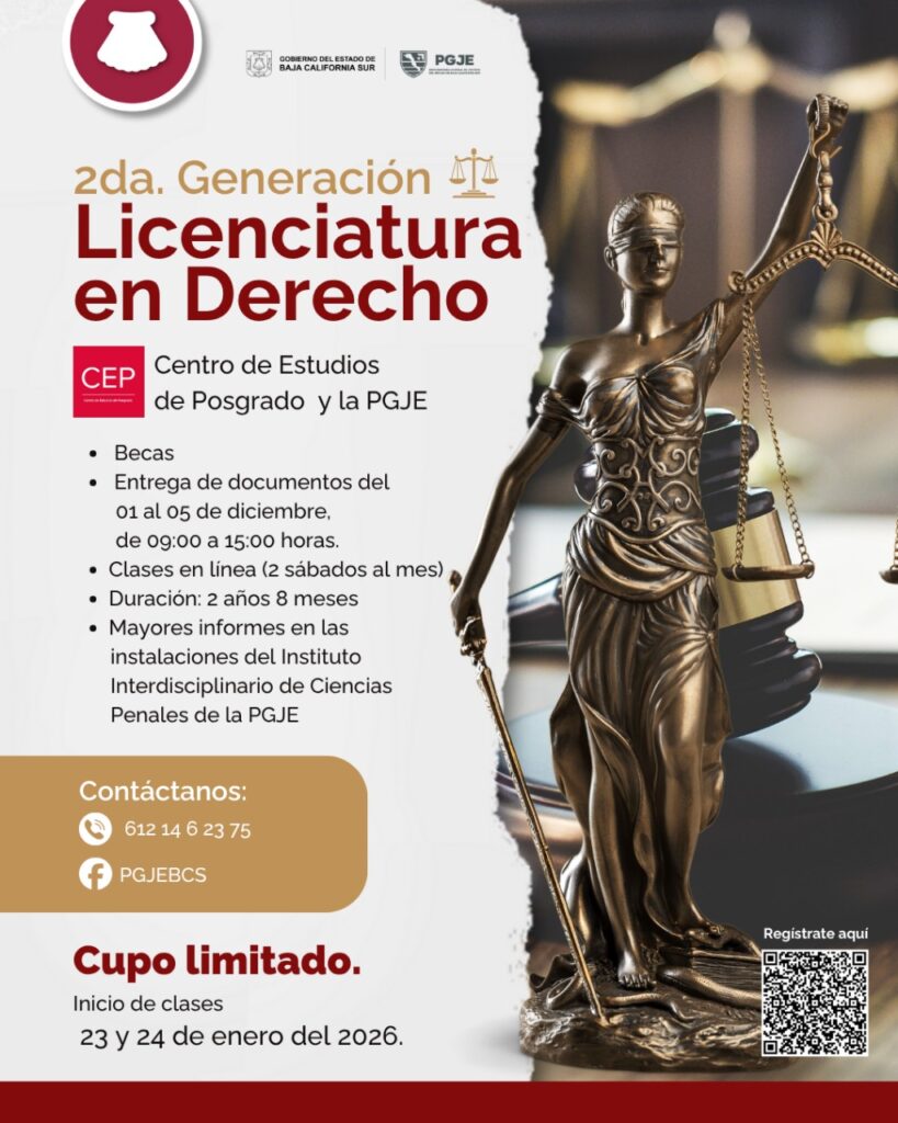 La Procuraduría General de Justicia del Estado (PGJE) de Baja California Sur, lanzó la convocatoria para integrarse a la Segunda Generación de la Licenciatura en Derecho del Centro de Estudios de Posgrado (CEP), una oportunidad de formación académica dirigida al público en general, al personal de la institución y a las alumnas de la Preparatoria Abierta del Centro de Justicia para las Mujeres (CJM).
