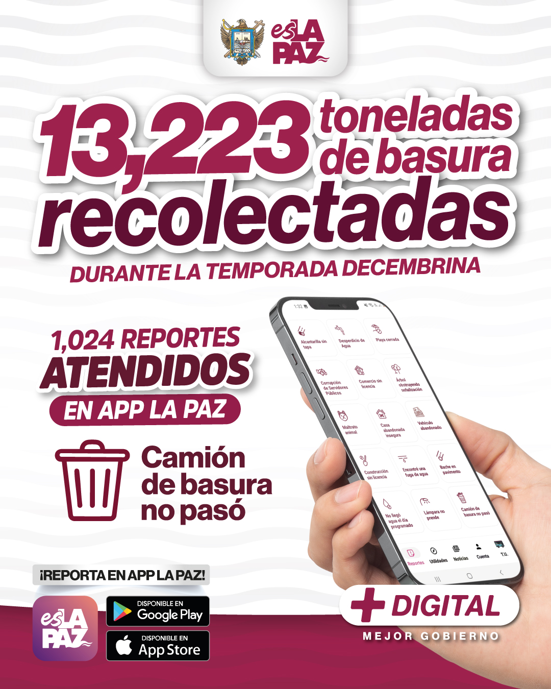 Como resultado de estas labores, se recolectaron 13,223 toneladas de residuos urbanos provenientes de domicilios y comercios de la ciudad. Además, se atendieron 1,024 reportes que la ciudadanía registró a través de App La Paz, en la opción “Camión de basura no pasó”.