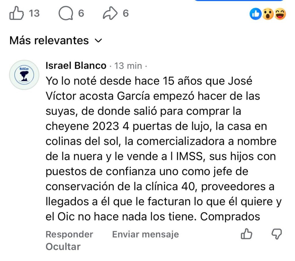 Dentro de los comentarios, algunos usuarios identificaron públicamente a José Víctor Acosta García, quien se desempeña como titular de la Jefatura de Servicios Administrativos del IMSS en Baja California Sur, área que, de acuerdo con la estructura institucional, tiene relación con procesos administrativos y de adquisición.