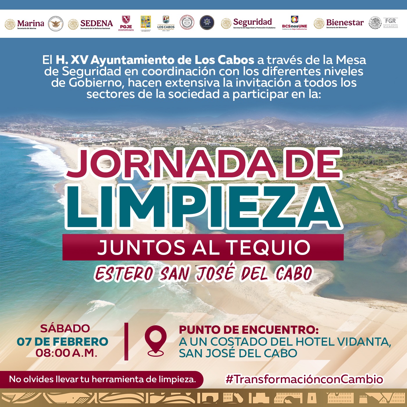 Los Cabos, Baja California Sur.- El XV Ayuntamiento de Los Cabos, a través de la Mesa de Seguridad y en coordinación con los diferentes niveles de Gobierno, hace una extensiva invitación a todos los sectores de la sociedad para participar en la jornada de limpieza denominada “Juntos al Tequio”, la cual se realizara en el Estero de San José del Cabo el próximo sábado 07 de febrero a partir de las 08:00 de la mañana.