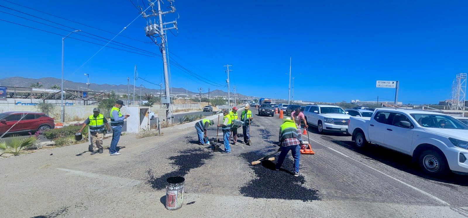 Los Cabos, Baja California Sur.– El XV Ayuntamiento de Los Cabos continúa con los trabajos del programa permanente “Caza Baches” en Cabo San Lucas, realizando intervenciones sobre la carretera Transpeninsular, a la altura de La Sanluqueña, uno de los tramos con mayor flujo vehicular en la ciudad.