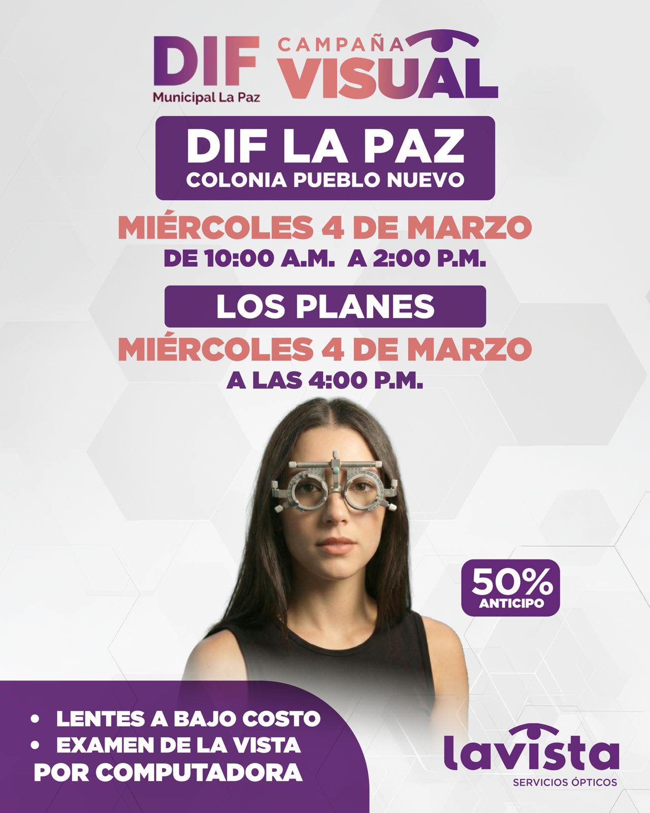 El DIF Municipal La Paz en coordinación con la iniciativa privada, llevarán a cabo una Campaña Visual con exámenes de la vista gratuitos y lentes a bajo costo, el próximo miércoles 4 de marzo, en la capital del Estado y en la delegación de Los Planes.