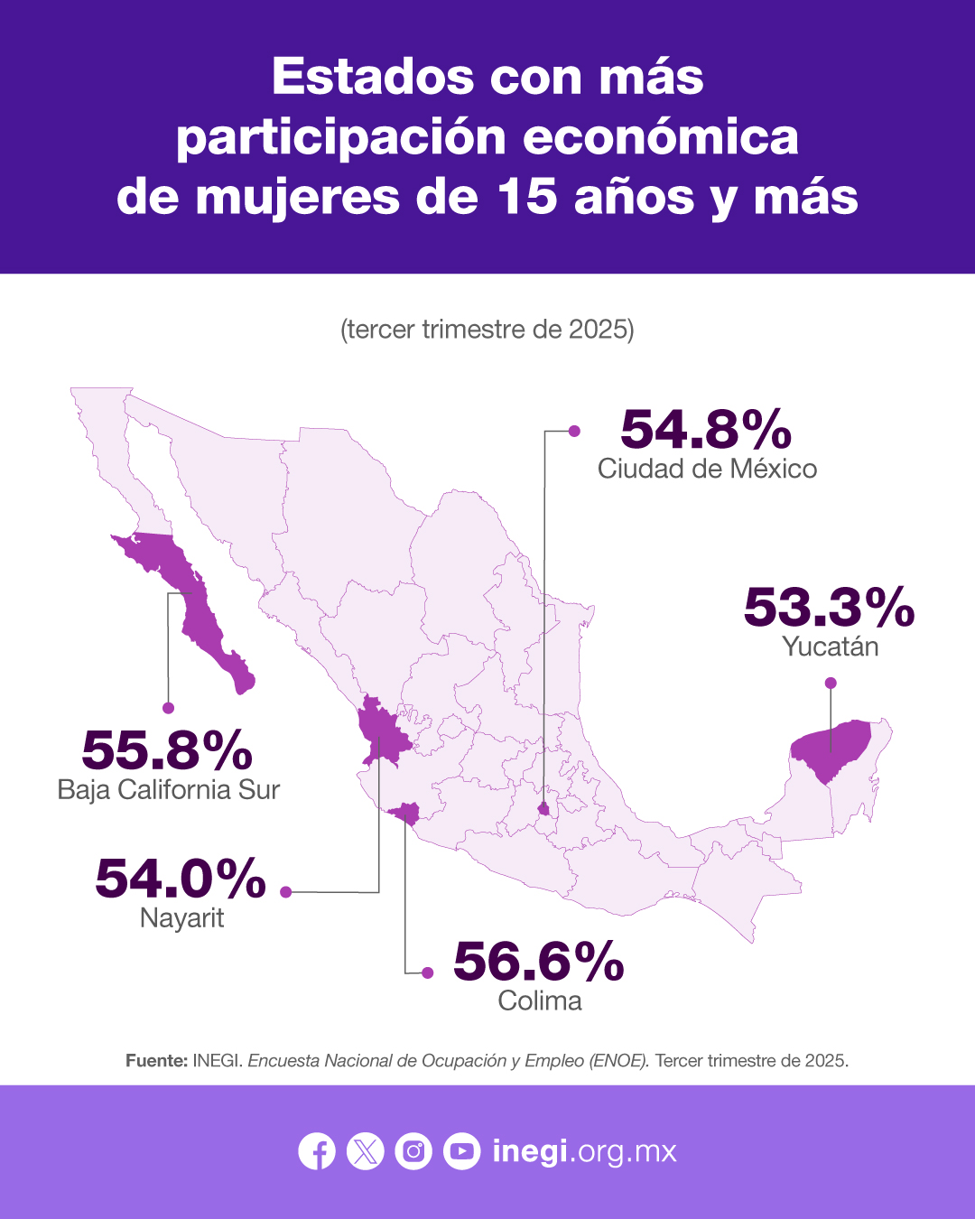 El titular de la dependencia estatal precisó que el 55.8% de las mujeres de 15 años y más en la entidad participan en la economía, ya sea trabajando o buscando empleo, ubicando a Baja California Sur por debajo de Colima (56.6%) y por encima de Ciudad de México (54.8%).